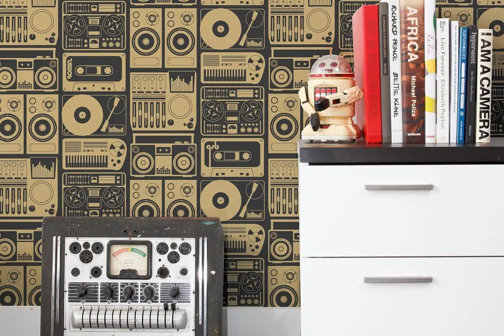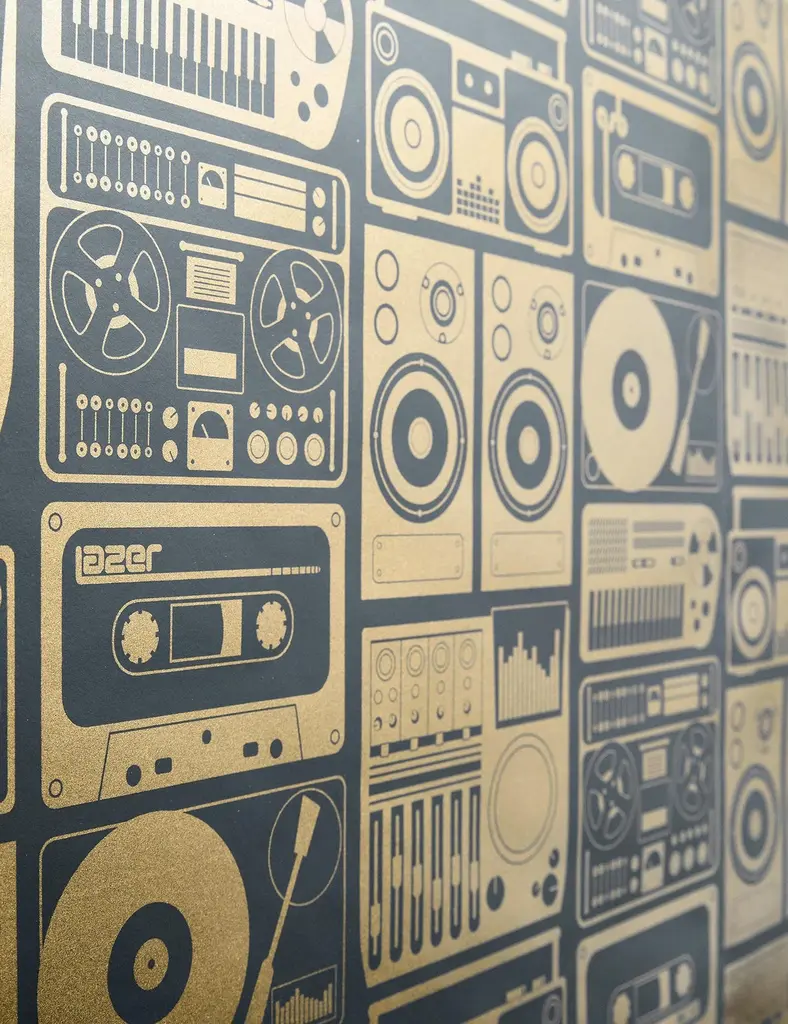This best-selling graphic wallpaper is available to order by the roll or sample—the perfect décor for kids, adult, your home or business. Samples are available for $18 including US shipping, please message us to purchase. Printing: Screen-printed by hand (minimum order and setup fees apply). Material: FSC-certified paper. Trimming: This product may come pre-trimmed or untrimmed. Packaging: May be shipped as double rolls, or as a combination of double and single rolls. Single roll: 27 inches × 5 yards (68.8 cm × 4.5 meters) Sample: 8 × 10 inches (20.3 × 25.4 cm) Design Repeat: 33.5 inches (85 cm) Design Match: Half-Drop Size note: One boombox measures 6.5 inches (16.5 cm) wide Made in the USA. Ships worldwide.Commercial grade options available; please contact us for more information.