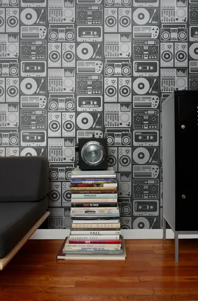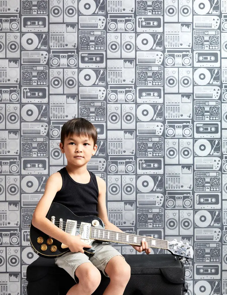 This best-selling graphic wallpaper is available to order by the roll or sample—the perfect décor for kids, adult, your home or business. Samples are available for $18 including US shipping, please message us to purchase. Printing: Screen-printed by hand (minimum order and setup fees apply). Material: FSC-certified paper. Trimming: This product may come pre-trimmed or untrimmed. Packaging: May be shipped as double rolls, or as a combination of double and single rolls. Single roll: 27 inches × 5 yards (68.8 cm × 4.5 meters) Sample: 8 × 10 inches (20.3 × 25.4 cm) Design Repeat: 33.5 inches (85 cm) Design Match: Half-Drop Size note: One boombox measures 6.5 inches (16.5 cm) wide Made in the USA. Ships worldwide.Commercial grade options available; please contact us for more information.