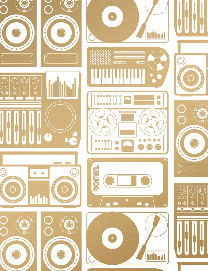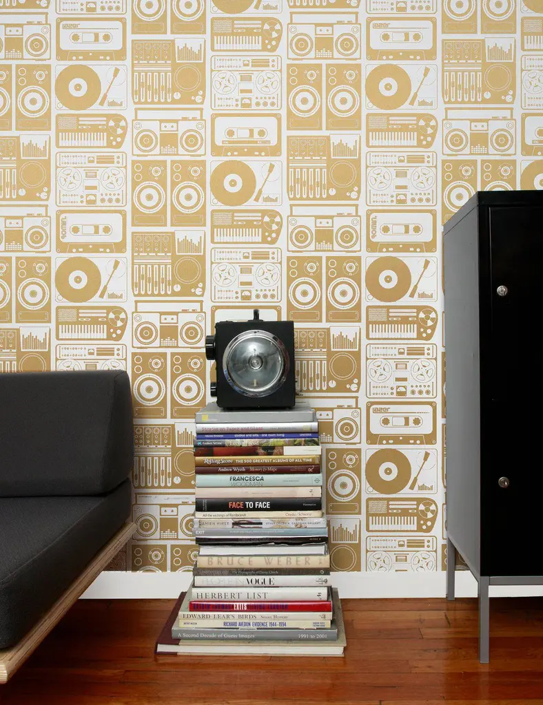 This best-selling graphic wallpaper is available to order by the roll or sample—the perfect décor for kids, adult, your home or business. Samples are available for $18 including US shipping, please message us to purchase. Printing: Screen-printed by hand (minimum order and setup fees apply). Material: FSC-certified paper. Trimming: This product may come pre-trimmed or untrimmed. Packaging: May be shipped as double rolls, or as a combination of double and single rolls. Single roll: 27 inches × 5 yards (68.8 cm × 4.5 meters) Sample: 8 × 10 inches (20.3 × 25.4 cm) Design Repeat: 33.5 inches (85 cm) Design Match: Half-Drop Size note: One boombox measures 6.5 inches (16.5 cm) wide Made in the USA. Ships worldwide.Commercial grade options available; please contact us for more information.