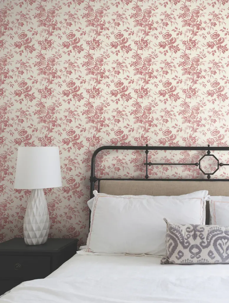 Incredibly artistic detailing in rich red ink makes Anemone Toile a perfect example of timeless floral trail elegance. This Anemone Toile Wallpaper measures approximately 20.5 inches wide by 33 feet long, measuring approximately 56.4 square feet per roll. The quintessential design for timeless romance, toile traces its origins to 18th century fabrics. This celebrated motif is explored with a range of classical reproductions and modern reimaginings. Prepasted sure strip material; 20.5-in repeat, straight match; Washable and strippable; 20.5-in by 33-ft long roll; Covers about 56.4 square feet