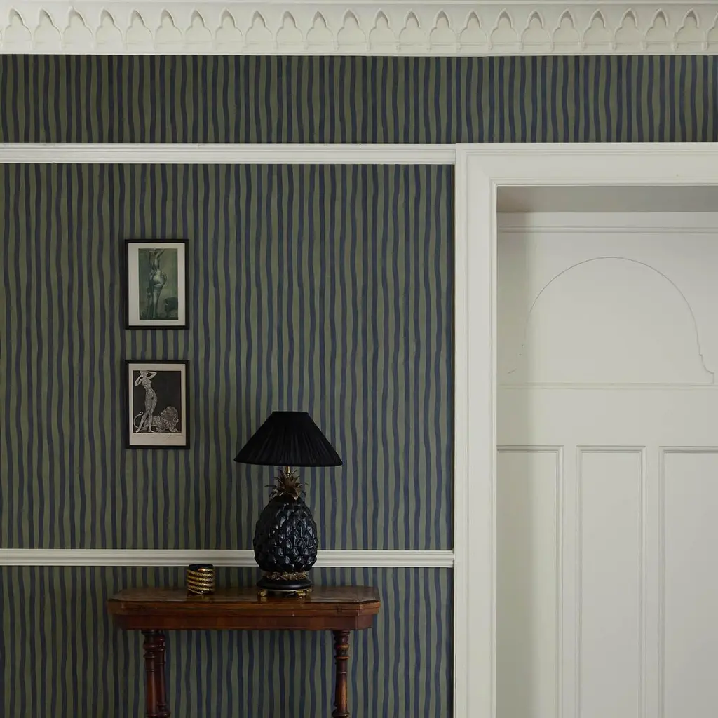 Make a statement with ARTIST’S STRIPE. Our perfectly imperfect hand-painted liquorice stripes sit against a backdrop of forest green, giving the classic striped wallpaper a rock‘n’roll twist; perfect for making an entrance in hallways, and making a noise in dining rooms and living areas.Our wallpaper is made using Forest Stewardship Council (FSC) certified, purposely grown materials, printed with water-based, environmentally safe inks, is PVC-free and made especially to order, reducing waste.