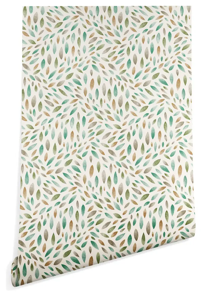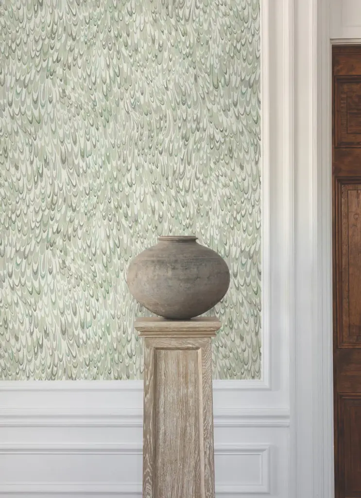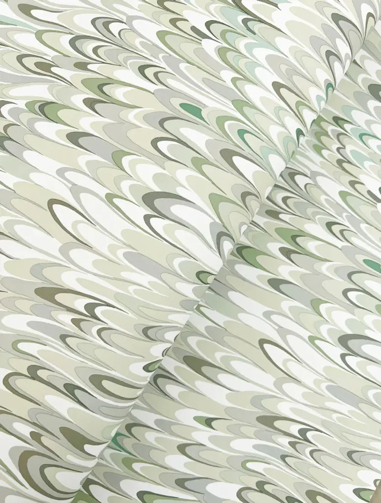 The craft of marbling paper inspires the motion and artistry of pattern Aslan, shown in grass green and grey neutrals on off-white. This Aslan Wallpaper measures approximately 27 inches wide by 27 feet long, measuring approximately 60.8 square feet per roll. The distinction of timeless style. Unpasted non woven material. 20.5-in repeat, drop match. Washable and strippable. 27-in by 27-ft long roll. Covers about 60.8 square feet