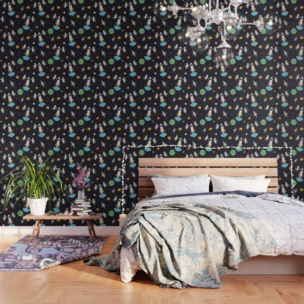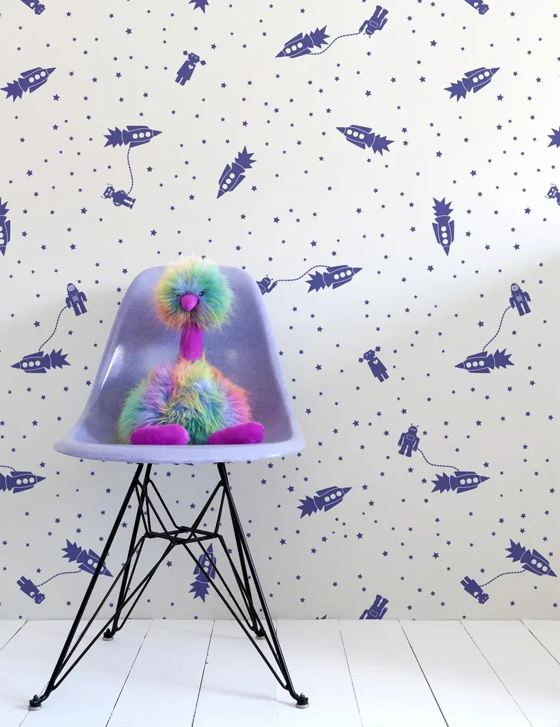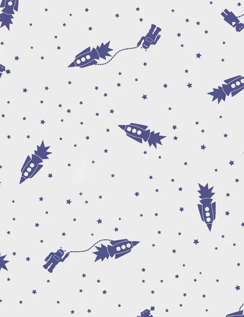 This wall-covering with a galactic scene has Robots in outer space, rocket ships & more... the perfect wallpaper for your child's room.Samples are available for $18 including US shipping, please message us to purchase.Printing: Screen-printed by hand.Material: FSC-certified paper. Trimming: This product may come pre-trimmed or untrimmed. Packaging: May be shipped as double rolls, or as a combination of double and single rolls. Single roll: 27 inches × 5 yards (68.8 cm × 4.5 meters) Sheet: 27 × 36 inches (68.8 × 91.4 cm)Sample:~ 8 × 10 inches (20.3 × 25.4 cm)Design Repeat: 36 inches (91.5 cm)Design Match: Straight Size note: One rocket measures 3.5 inches (8.9 cm) tall.Made in the USA. Ships worldwide.Commercial grade options available; please contact us for more information.