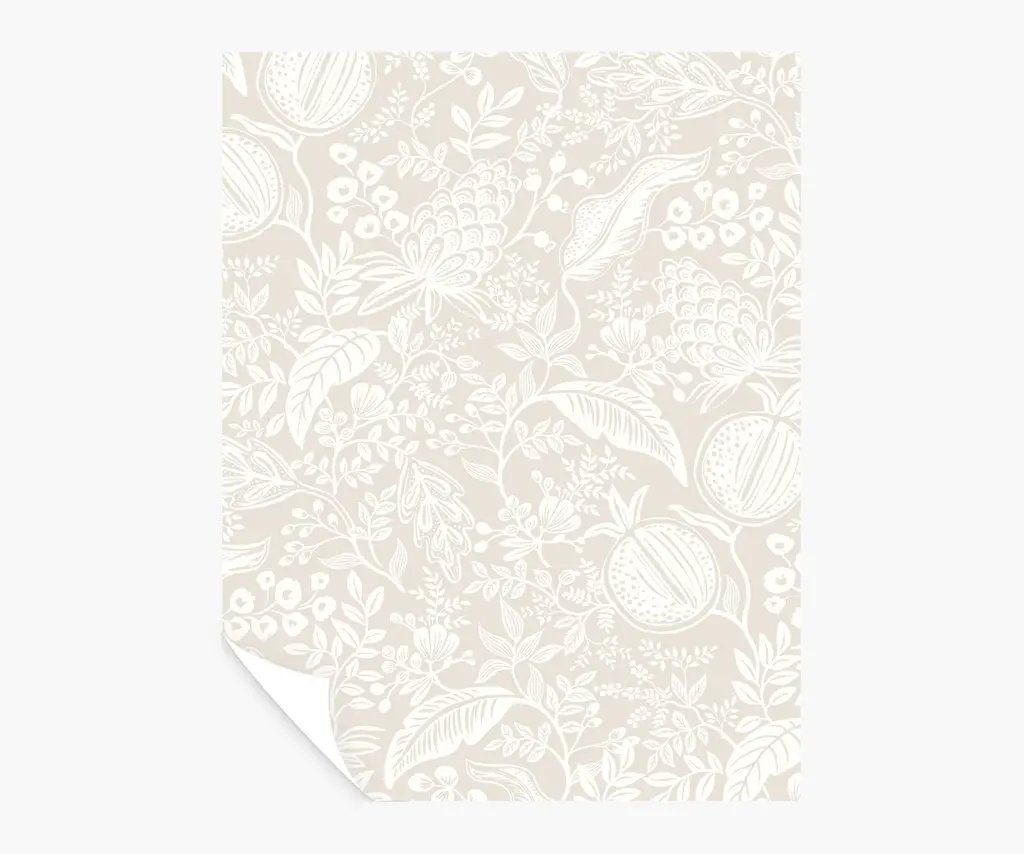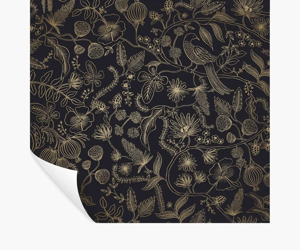 The intricate linework of the two-color Aviary print was originally created from a pen-and-ink drawing. Named for the birds perched on the winding branches, it also features poppy pods and blooming flowers. This peel & stick wallpaper can easily be removed, making it perfect for rentals and accent walls. The paper is gravure printed with metallic ink and comes in 27 inch rolls with a 24 inch repeat. Due to the printing process, there may be color variations in different print runs. We suggest purchasing all wallpaper needed for a project at one time for the best color consistency. Unopened rolls can be returned.