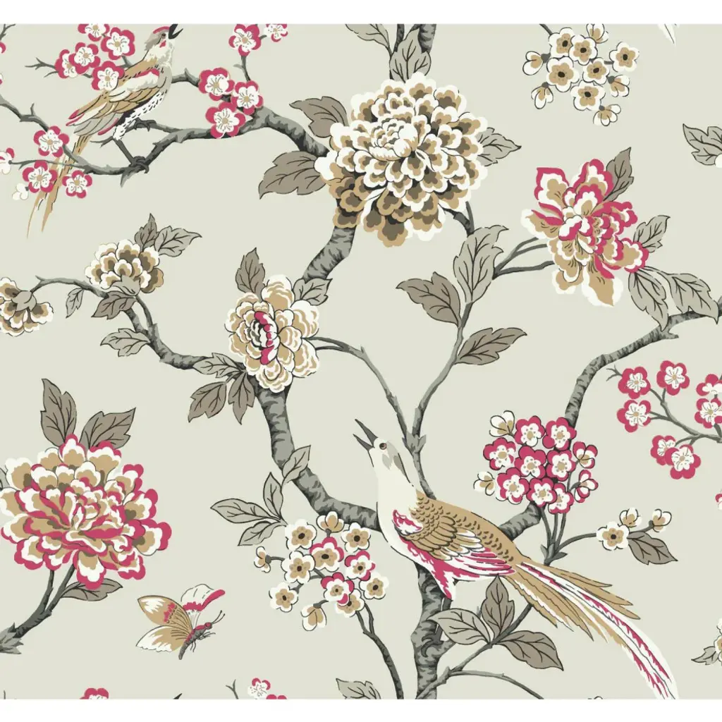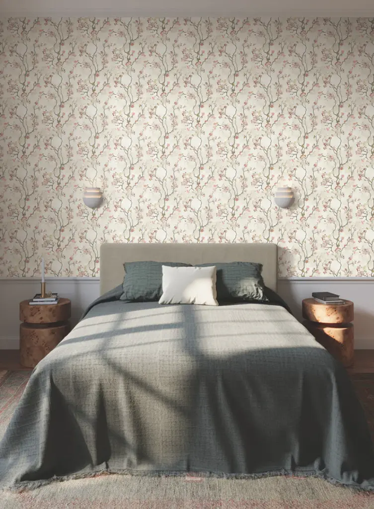 Western paintings of flowering branches compose Avril Chinoiserie with the exotic air of mystery associated with classic Asian art and style, sown in peacock blue on misty grey. This Avril Chinoiserie Wallpaper measures approximately 27 inches wide by 27 feet long, measuring approximately 60.8 square feet per roll. A retrospective from the private collections of Christiane Lemieux featuring global, artistic, and handcrafted designs. Unpasted non woven material; 24-in repeat, straight match; Washable and strippable; 27-in by 27-ft long roll; Covers about 60.8 square feet