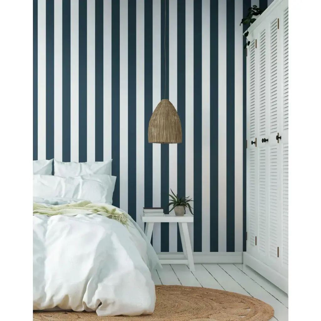 The allure of coastal-chic interiors beckons, with an easy elegance that speaks to the playful pace and casual luxury of living by the water''s edge. Manufactured on Sure Strip, a unique high performance substrate, this ultra-easy removable wallpaper is guaranteed easy to install and easy to remove; simply use water to activate. The textual inks of pattern Awning Stripe enhance and elevate this sophisticated classic pattern. Includes 1 roll - 20.5 in x 33 ft = 56 sq ft with a random match and no repeat.