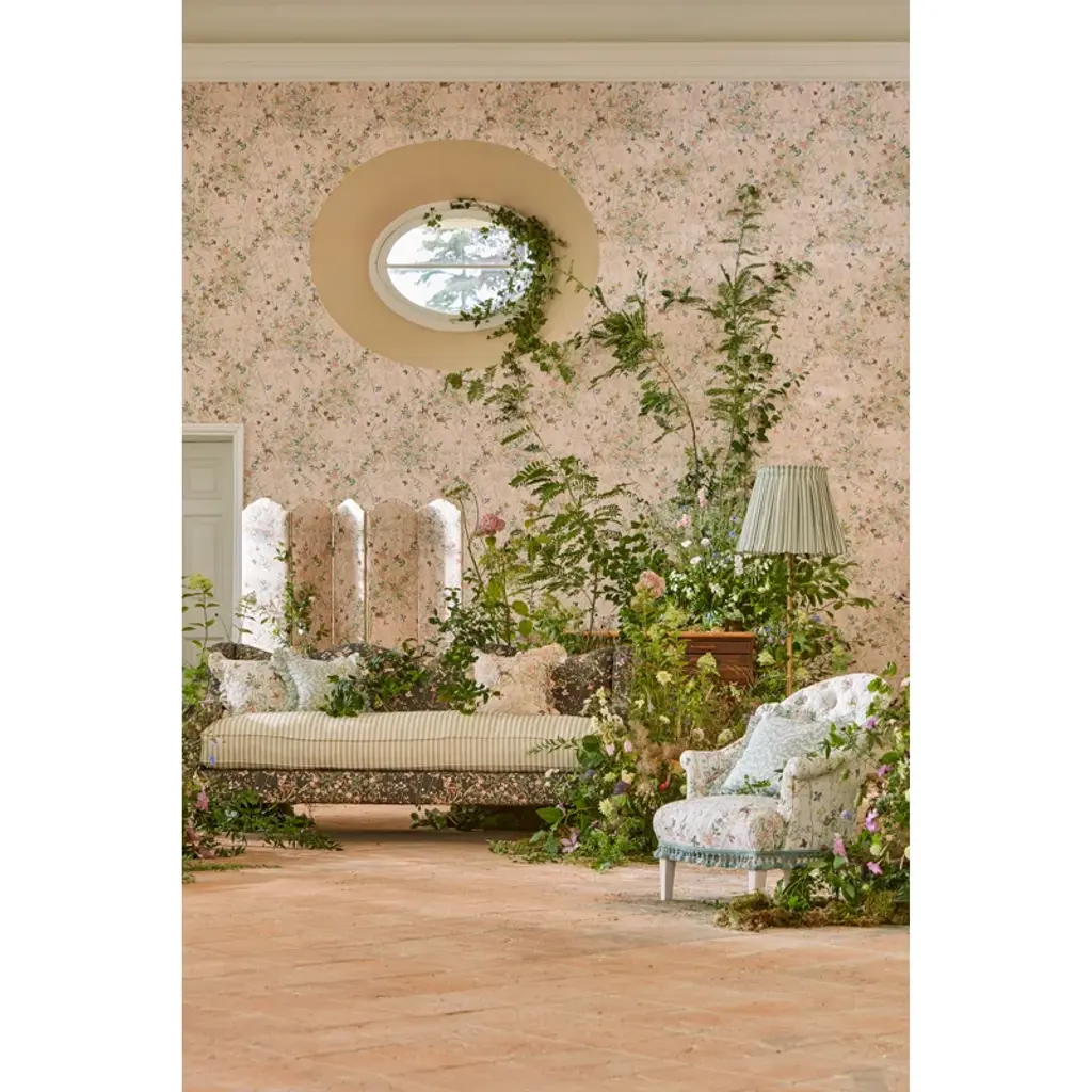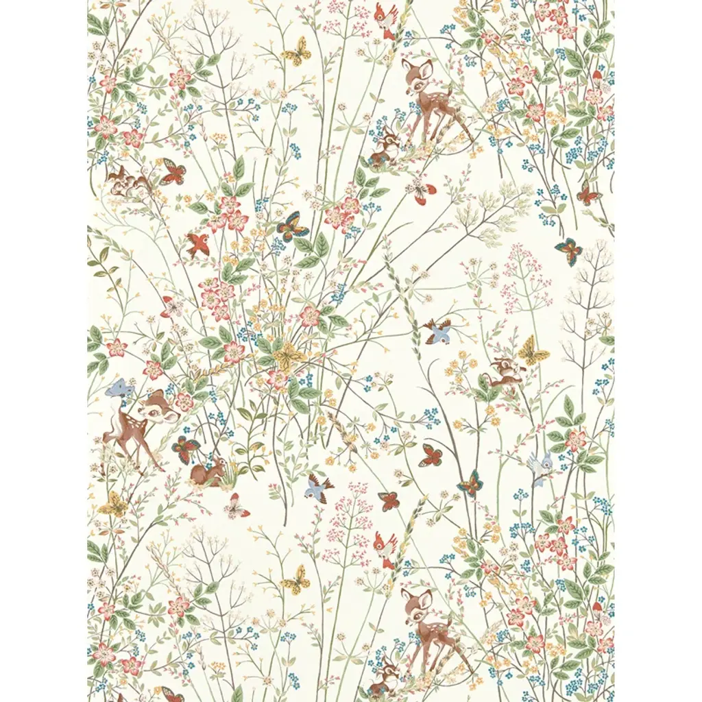 A host of woodland friends join Disney's Bambi in this charming springtime scene of archival Sanderson florals. Created especially for the collection and hand-painted in gouache, share a whimsical, quintessentially English feel.
