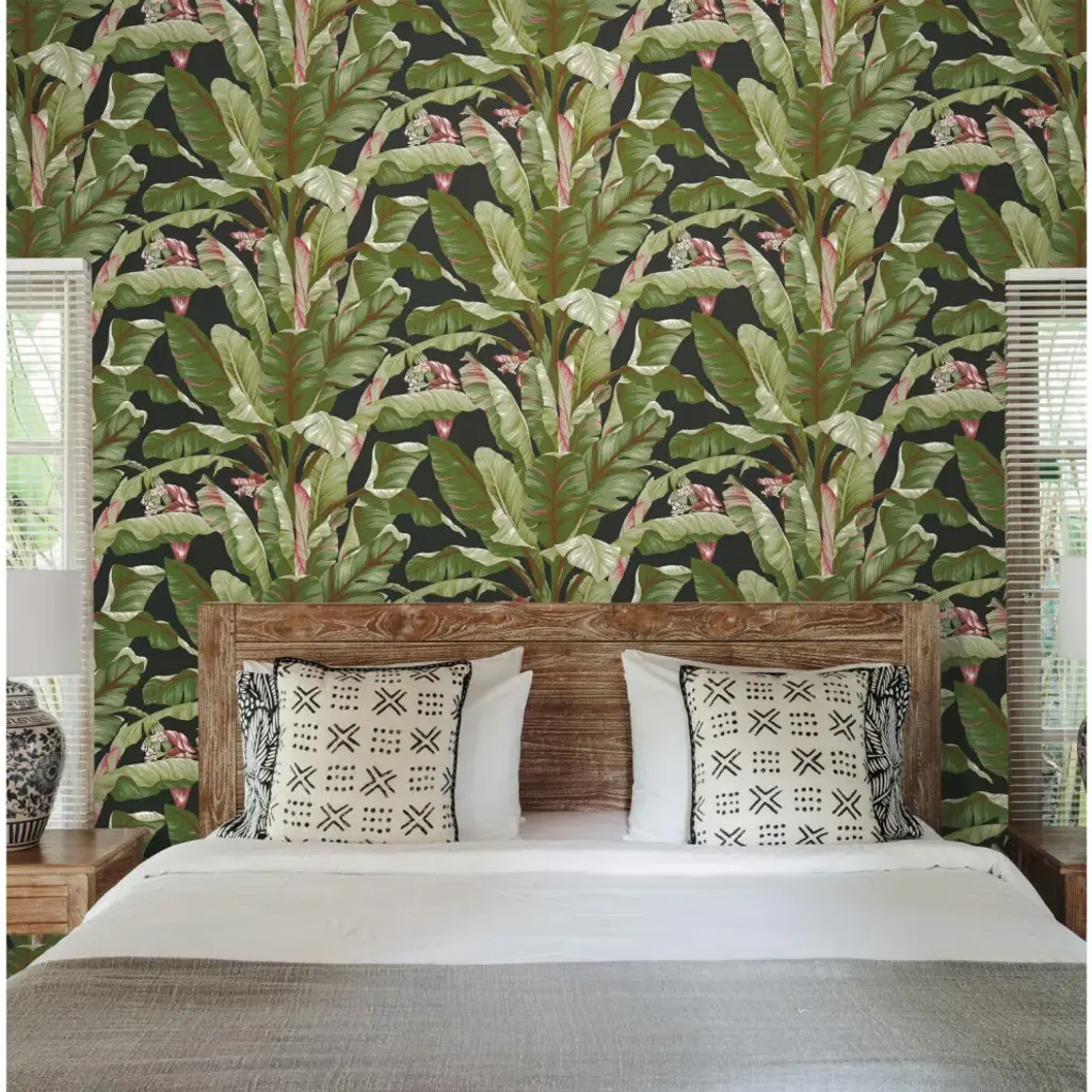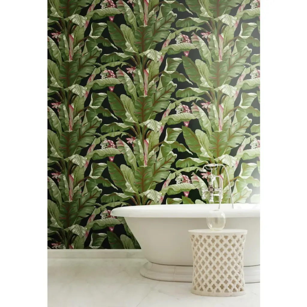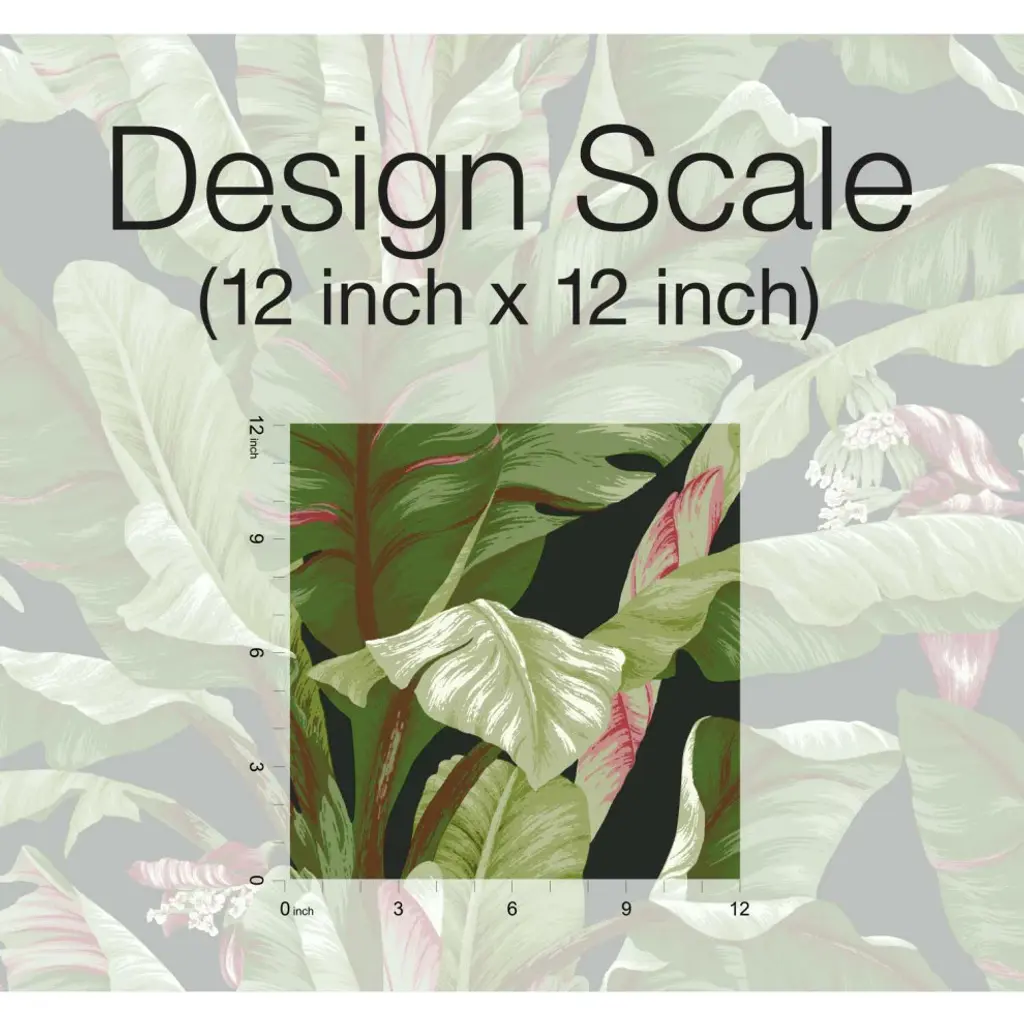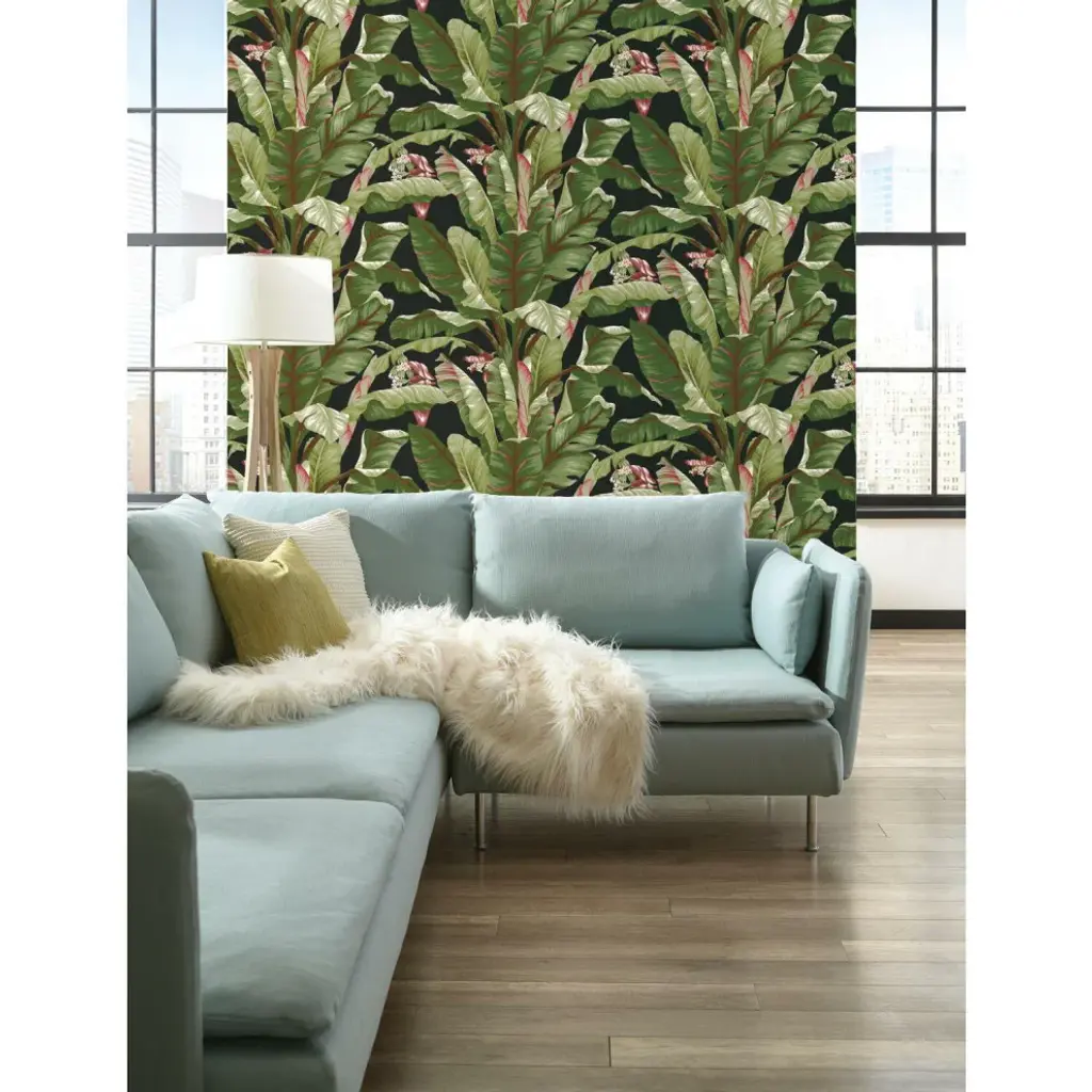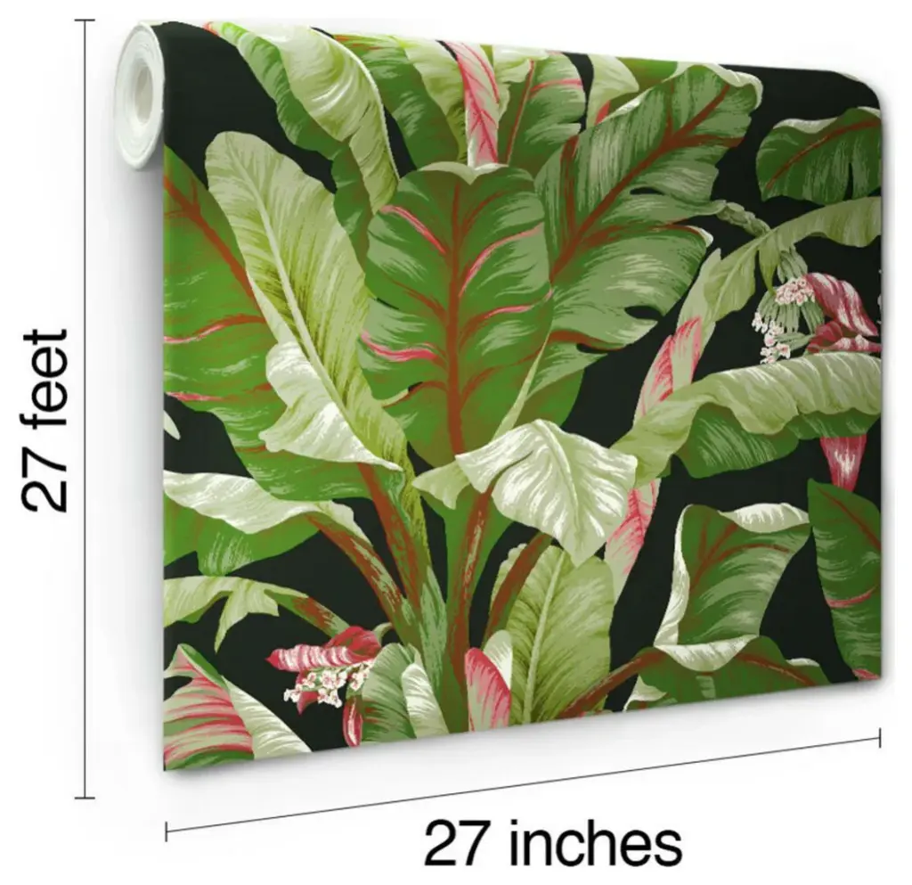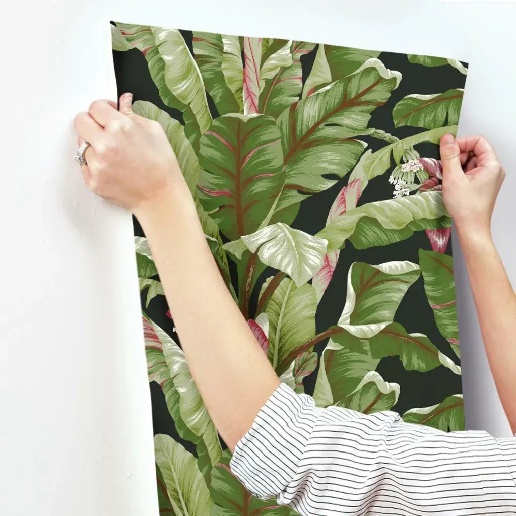 Tropical style is much more than untamed gardens of exotic beauty. It is the embodiment of modern affluent lifestyle and leisure. Manufactured on Sure Strip, a unique high performance substrate, this ultra-easy removable wallpaper is guaranteed easy to install and easy to remove; simply use water to activate. The flowering palms of pattern Banana Leaf sway in tropical breezes, invoking memories from a classic age of glamour. Includes 1 roll - 27 in x 27 ft = 60.75 sq ft with a drop match and 25.25 in repeat.