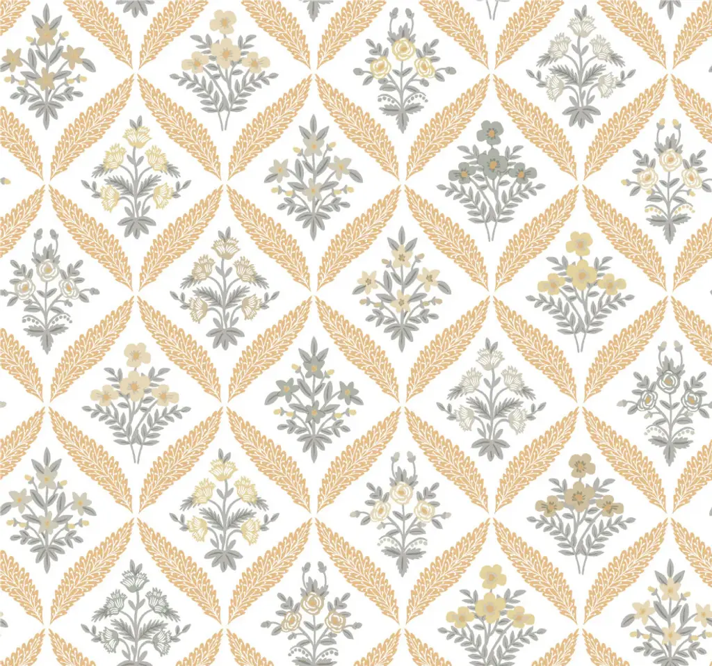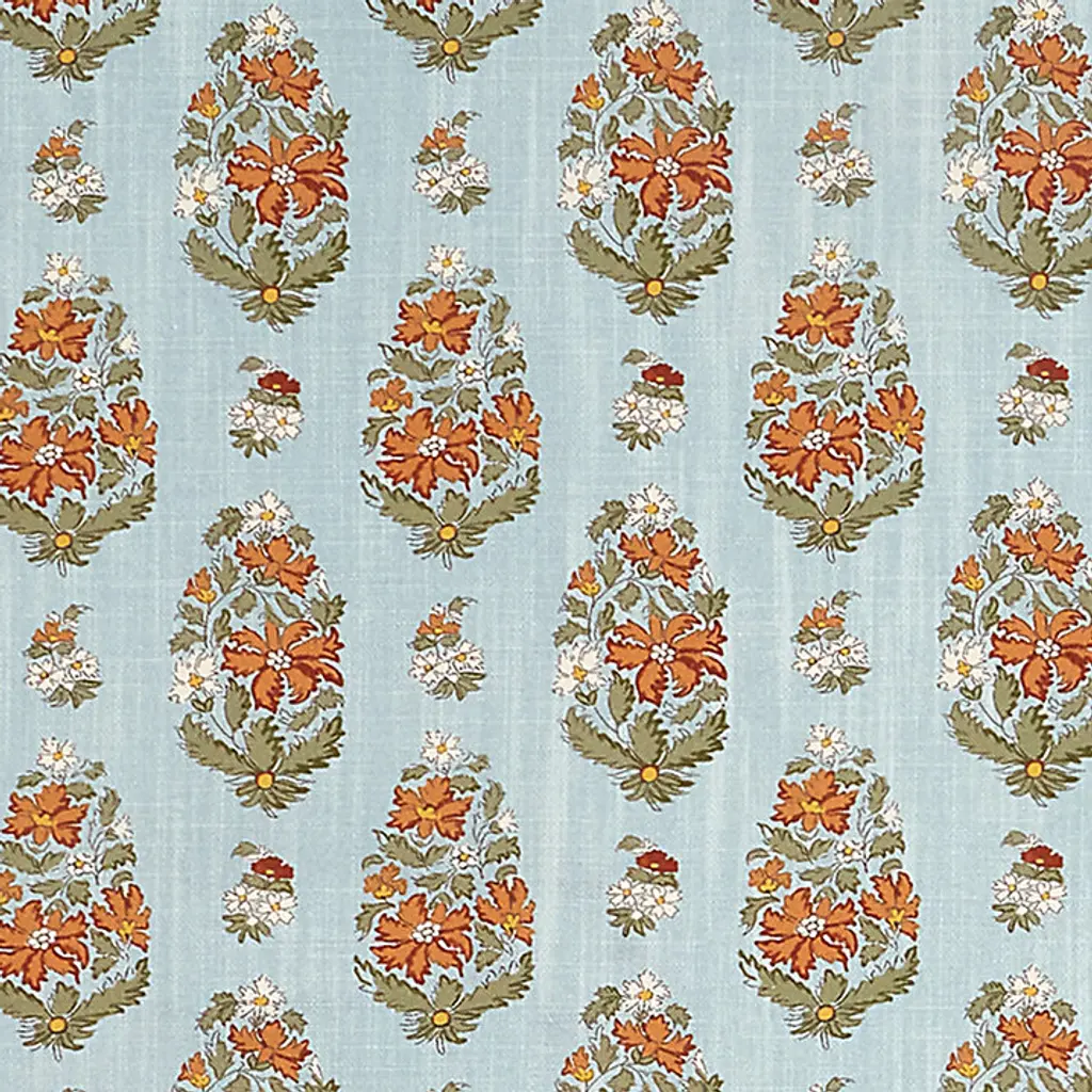Our Beatrice Apricot Wallpaper was inspired by a classic Indian block print. The sweet floral motif is printed on non-woven paper in hues of sage, apricot, goldenrod, and touches of red on a sky blue background. Beatrice Apricot is available in matching fabric by the yard, so you can coordinate your walls with upholstery, drapery panels, and decorative pillows for a custom designer look Part of our exclusive Cotswolds Collection of Fabric and Wallpaper, this beautiful wall covering and its matching fabric were created especially for us by a century-old textile and wallpaper printer in the heart of England. The quintessentially British firm is world renowned for its exquisite patterns, lush colors, and time-honored craftsmanship. Beatrice Apricot Wallpaper features: