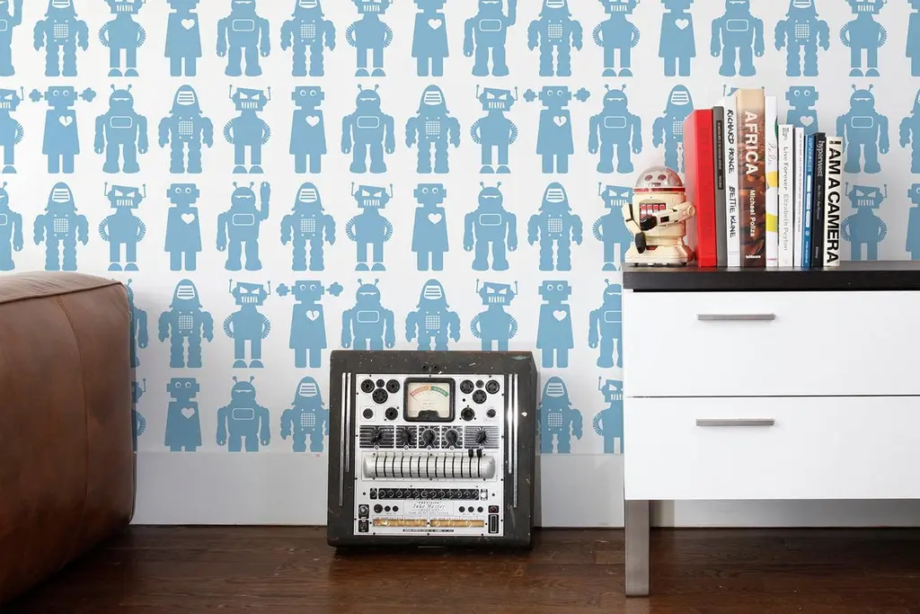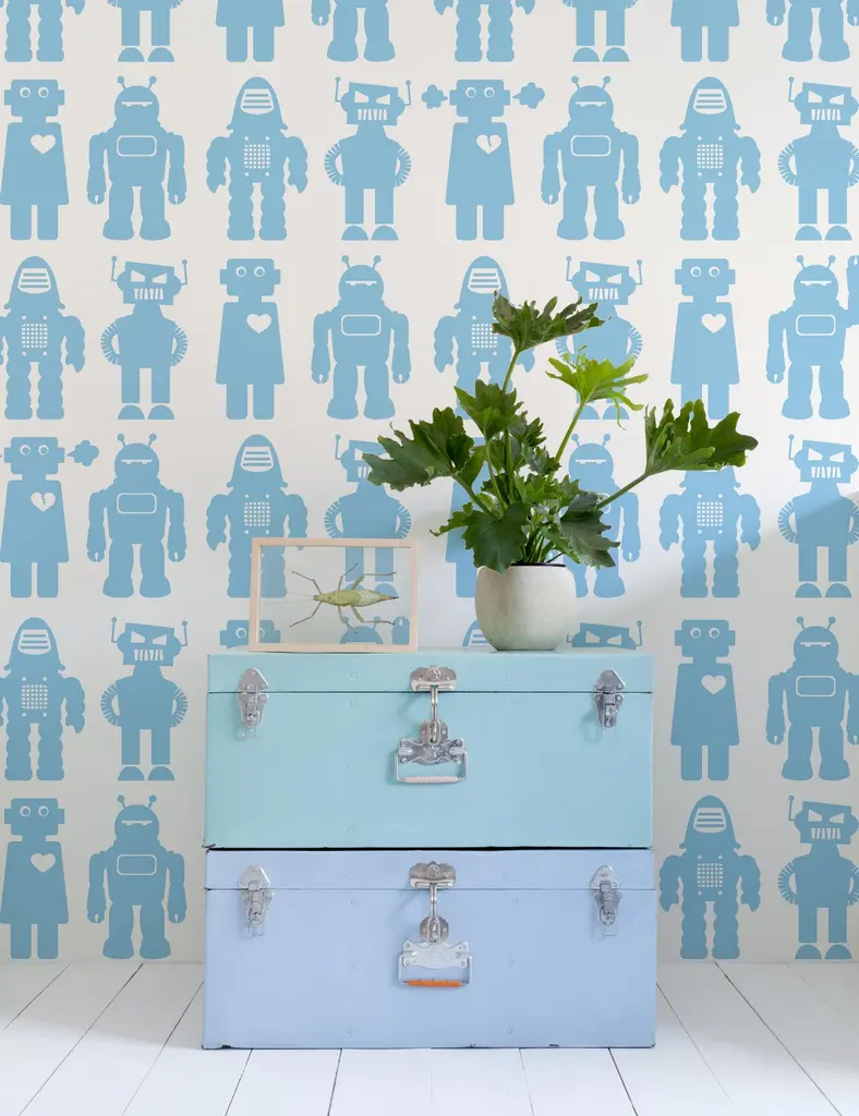 This classic robots pattern by Aimée is screen-printed by hand on clay-coated, FSC-certified paper.Samples are available for $18 including US shipping, please message us to purchase.Printing: Screen-printed by hand (must be ordered in even increments).Material: FSC-certified paper. Trimming: This product may come pre-trimmed or untrimmed. Packaging: May be shipped as double rolls, or as a combination of double and single rolls. Single roll: 26 inches × 5 yards (66 cm × 4.5 meters) Sheet: 26 × 36 inches (66 × 91.4 cm)Sample:~ 8 × 10 inches (20.3 × 25.4 cm)Design Repeat: 39 inches (99 cm)Design Match: Straight Size note: One robot measures 9.75 inches (24.8 cm) tall.Made in the USA. Ships worldwide.Commercial grade options available; please contact us for more information.