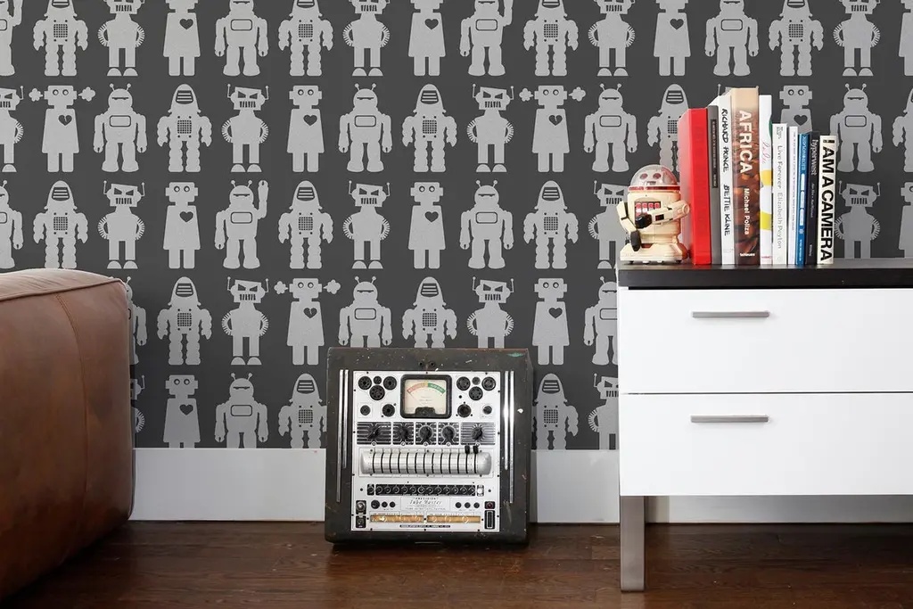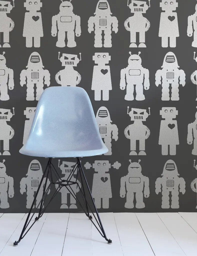 This classic robots pattern by Aimée is screen-printed by hand on clay-coated, FSC-certified paper.Samples are available for $18 including US shipping, please message us to purchase.Printing: Screen-printed by hand (minimum order and setup fees apply).Material: FSC-certified paper. Trimming: This product may come pre-trimmed or untrimmed. Packaging: May be shipped as double rolls, or as a combination of double and single rolls. Single roll: 26 inches × 5 yards (66 cm × 4.5 meters) Sheet: 26 × 36 inches (66 × 91.4 cm)Sample:~ 8 × 10 inches (20.3 × 25.4 cm)Design Repeat: 39 inches (99 cm)Design Match: Straight Size note: One robot measures 9.75 inches (24.8 cm) tall.Made in the USA. Ships worldwide.Commercial grade options available; please contact us for more information.