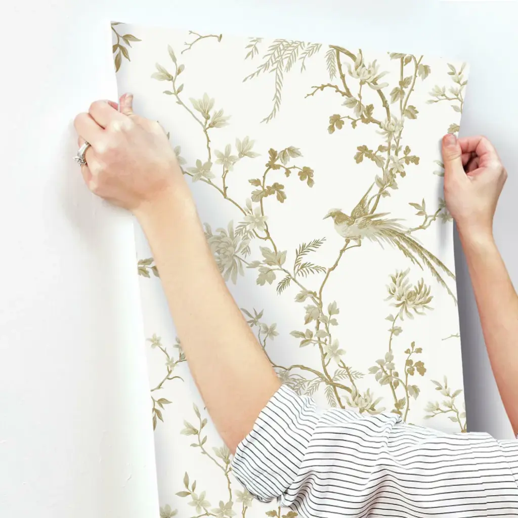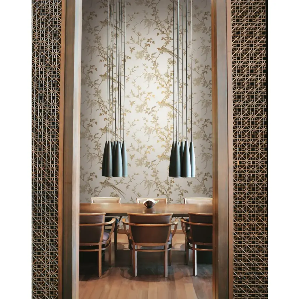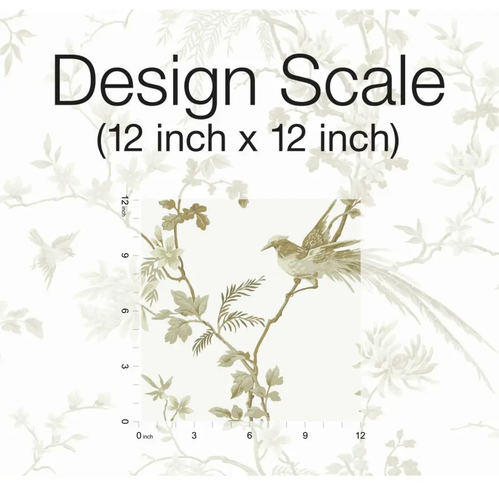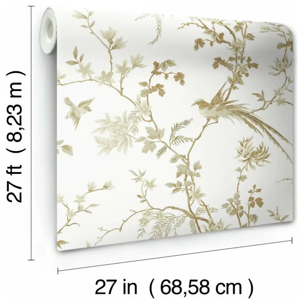 The lush foliage and songbirds of Bird and Blossom Chinoiserie create a surround of Asian inspired motifs against a luxurious metallic finish. This Bird & Blossom Chinoserie Wallpaper measures approximately 27 inches wide by 27 feet long, covering About 60.8 square feet per roll. Asian botanical influences define pattern Bird and Blossom Chinoiserie''s classic opulence and luxurious metallic finish. Unpasted non woven material; 25.25-in repeat, drop match; Washable and strippable; 27-in by 27-ft long roll; Covers about 60.8 square feet