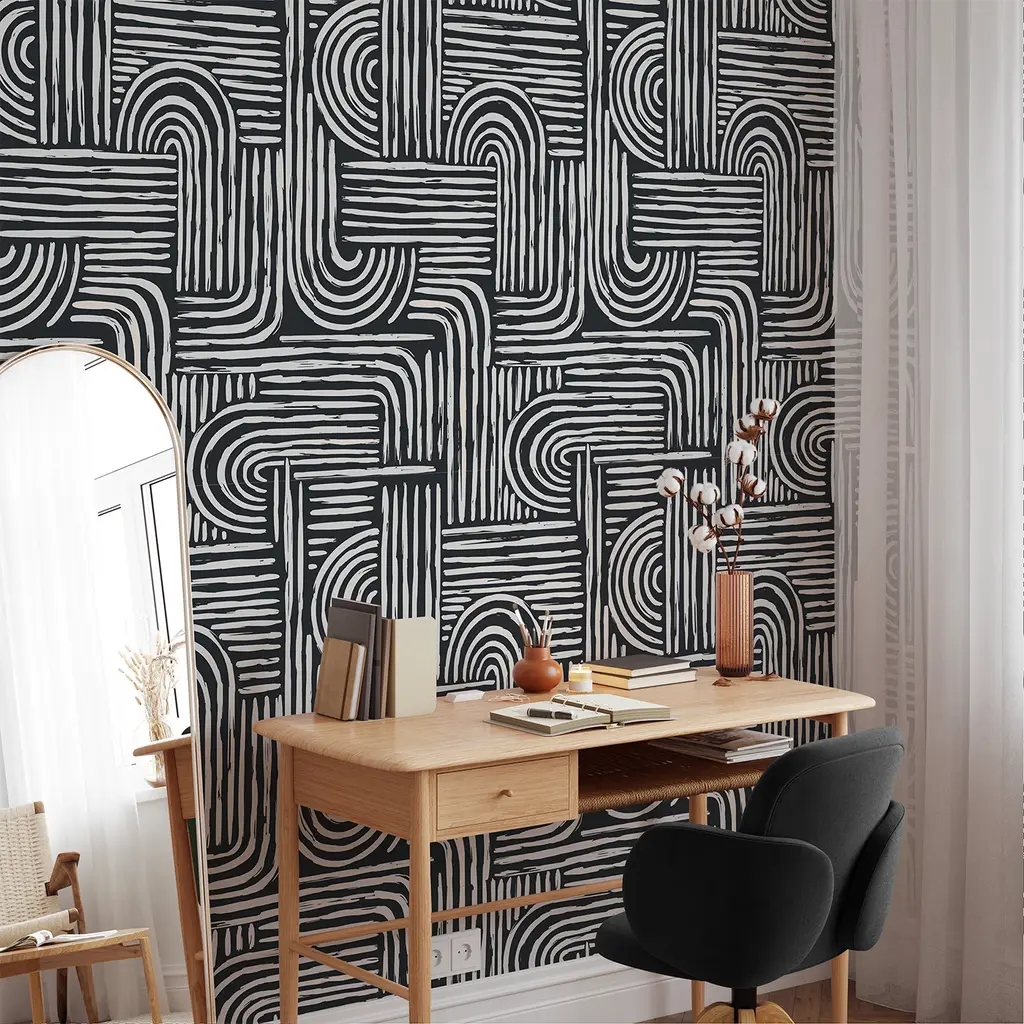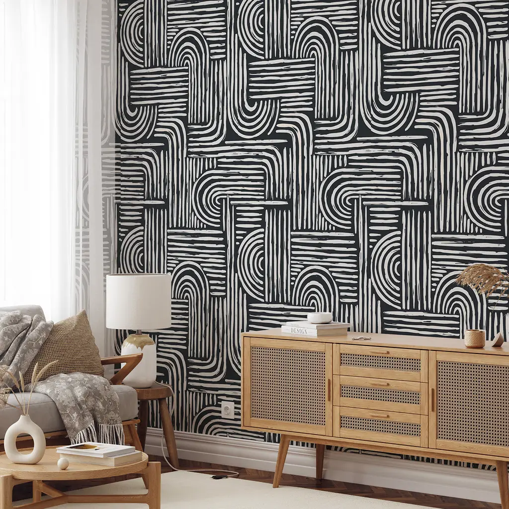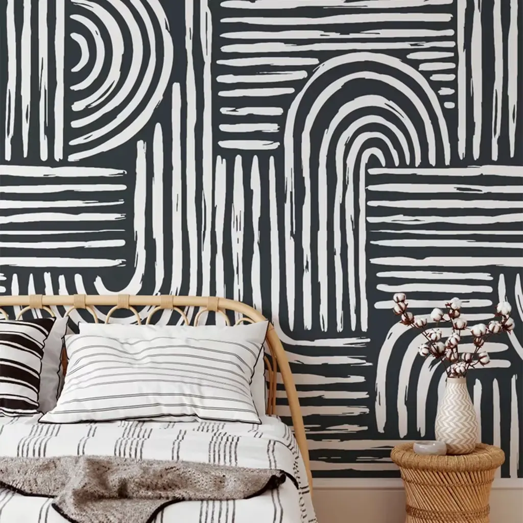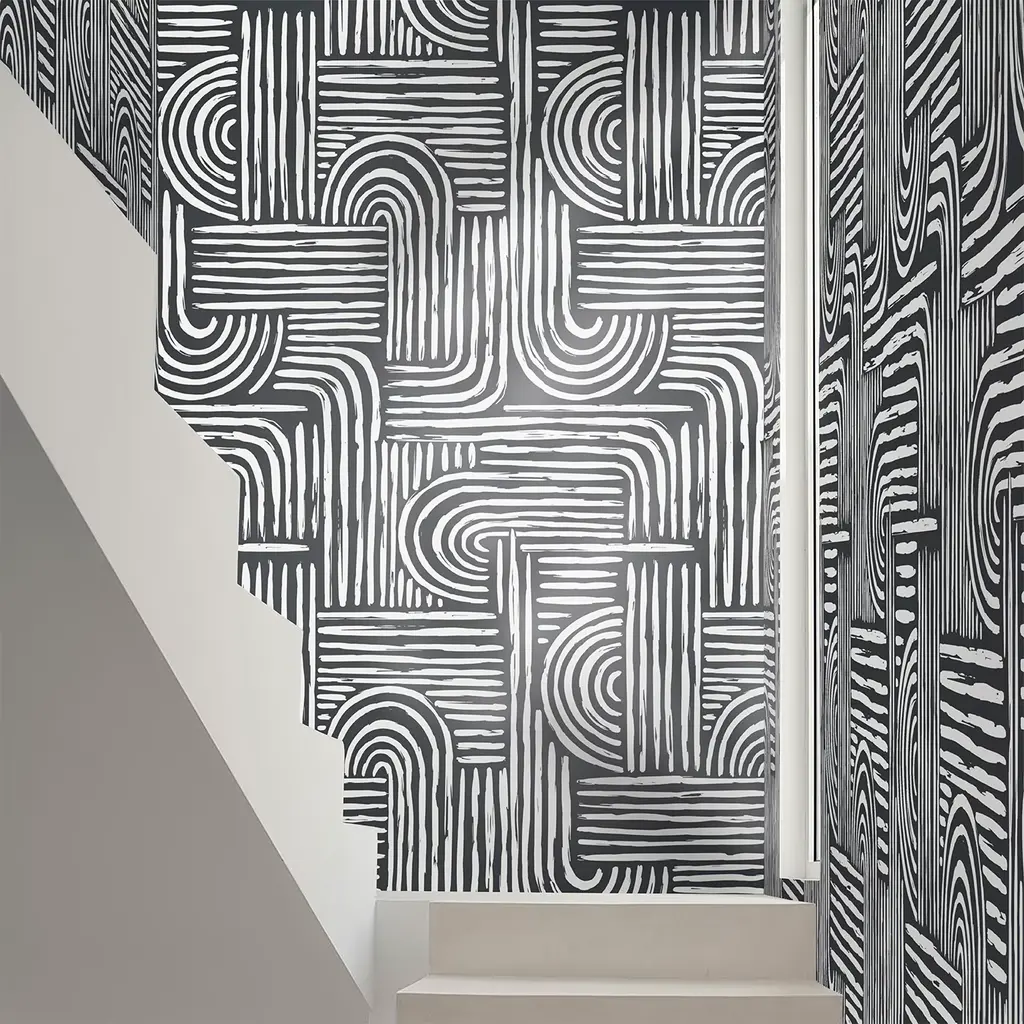 Ecological wallpaper, crafted from vegan water-based inks, designed and printed in Italy using the most advanced technologies. Versatile for walls, shelves, and furniture, for lovers of abstract and intriguing design this wall covering is a must-have. Created with the geometric brushstroke technique, it adds an artistic flavor, perfect for any space. It's a unique focal point in any setting. Instructions are included. Each sheet measures 27.5x39.4 inches/70x100 cm, covering a total area of 5 MQ.