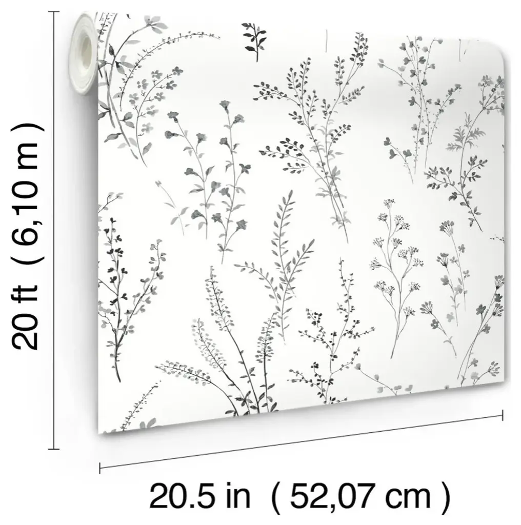 A morning meadow provides the graceful, airy watercolor sketch of the Wildflower Sprigs pattern, shown in charcoal, gray and black. This Wildflower Sprigs Peel and Stick Wallpaper measures approximately 20.5 inches wide by 20 feet long, measuring approximately 34.2 square feet per roll. Painterly illustrations of meadows, gardens, and greenery. Peel & Stick non woven material20.5-in repeat, drop matchWashable and fully removable20.5-in by 20-ft long rollCovers about 34.2 square feet