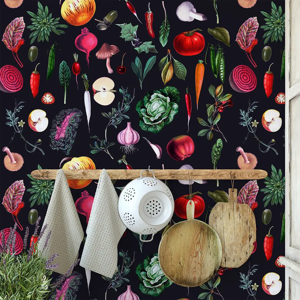 Eco-friendly wallpaper made of 100% ecological paper, painted with vegan water-based inks, and free of chemicals. Designed and printed in Italy, it's easy to apply and remove with hot water. Featuring charming vintage-style vegetable illustrations, it adds a modern touch to kitchen decor, perfect for creating a unique country-style accent wall that delights family and guests. Each pack includes 8 sheets. Each sheet measures 27.5x39.4 inches/70x100 cm, covering a total area of 5 MQ.