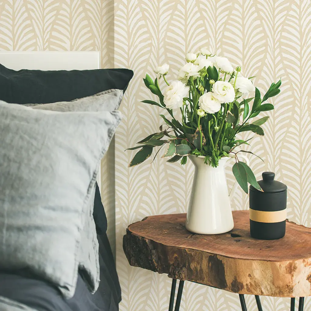 Inspired by wood carving print techniques, Tempaper's Block Print Leaves peel-and-stick wallpaper features palm leaves on an off-white background. With a bohemian twist, the palm motifs create a rhythmic look, making it perfect for bedrooms, nurseries, living rooms, and more. Elevate your decor with this stylish wallpaper solution. Tempaper & Co., the pioneers of peel and stick wallpaper, offers décor enthusiasts the freedom to be wonderfully creative when decorating. DIY-friendly product allows you to embrace pattern, texture, and color, and to create bold and expressive interiors that can be as temporary or as permanent as you like. Installation is a breeze, and it removes cleanly without harming walls. Breakthrough, proprietary product uses clean materials and meets strict standards. Apply peel and stick wallpaper to walls, stair risers, furniture, ceilings, bathrooms and more. The product works best when applied to surfaces that have been primed and painted with an eggshell, satin, or semi-gloss finish. Applications on flat and matte paints and textured surfaces are not recommended. Features