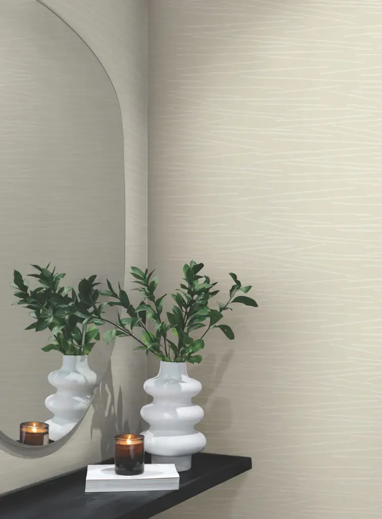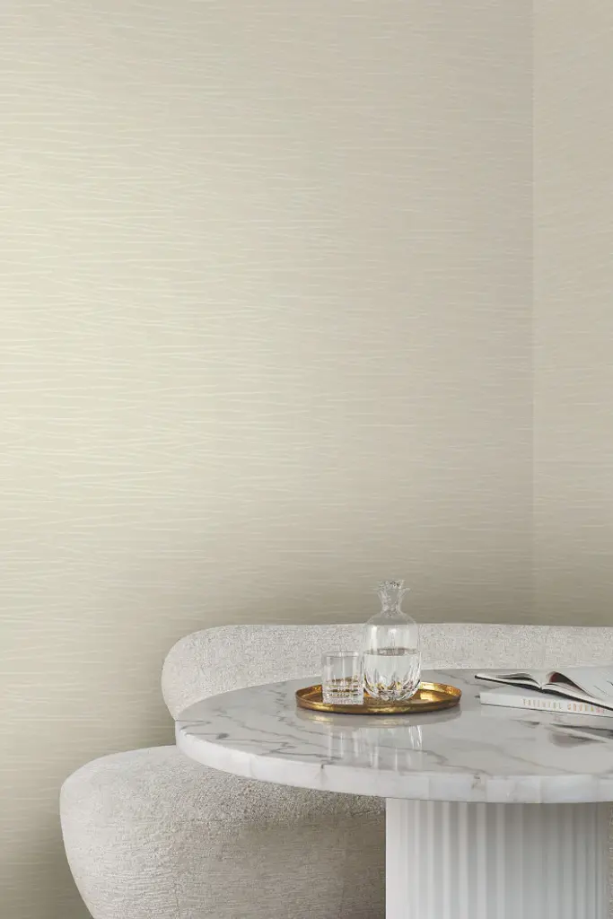 The horizontal, irregular motion of the pattern Line Horizon creates a minimalist field of undulating, beige and white waves. This Line Horizon Wallpaper measures approximately 27 inches wide by 27 feet long, measuring approximately 60.8 square feet per roll. Organic simplicity and lustrous adornment for the modern home. Unpasted non woven material25.25-in repeat, drop matchWashable and strippable27-in by 27-ft long rollCovers about 60.8 square feet