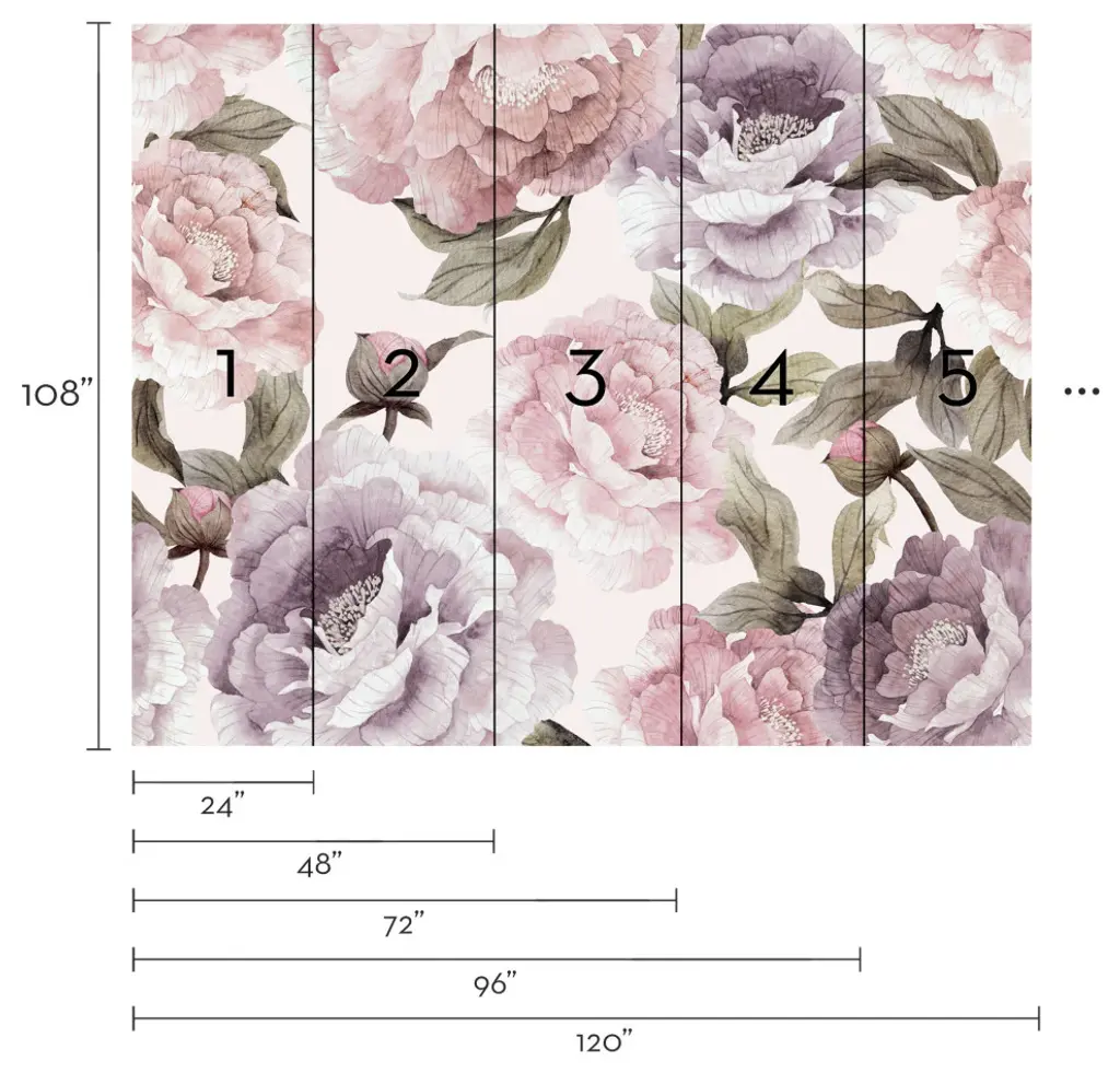 The overall pattern repeats every 5 sheets. Each sheet is sold individually, so you would order the amount that you need to fill your wall space. For example, if you have a wall that is 8 feet wide, you would need to order 4 sheets (you will receive sheets 1 through 4 as shown in the illustrated diagram).Size:24"w x 96"h24"w x 108"hPattern Repeat Length:every 120" wWhat''s Included:1 sheet of peel-and-stick vinyl wallpaper