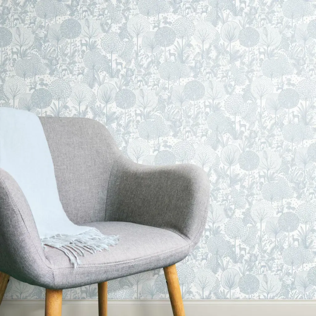 Comes with 1 roll - 18 inches wide x 18.86 feet. Design has a drop match with a 18 inch repeat. Covers 28.29 square feet. A whimsical glade in the forest surrounds the kindly animals who live within its protection in this toile-like Forest Friends peel and stick wallpaper from RoomMes. Gentle deer, friendly bunnies, wise owls and furry fox play among the ferns and toadstools th carpet the forest floor. Shades of sle blue and softest white cree a color palette th is pleasing for boys and girls alike. Peel and stick wallpapers are an easy and affordable way to decore; simply peel off the paper backing and smooth onto the wall. When it''s time to redecore, remove in full strips with no remaining sticky residue or damage to walls.