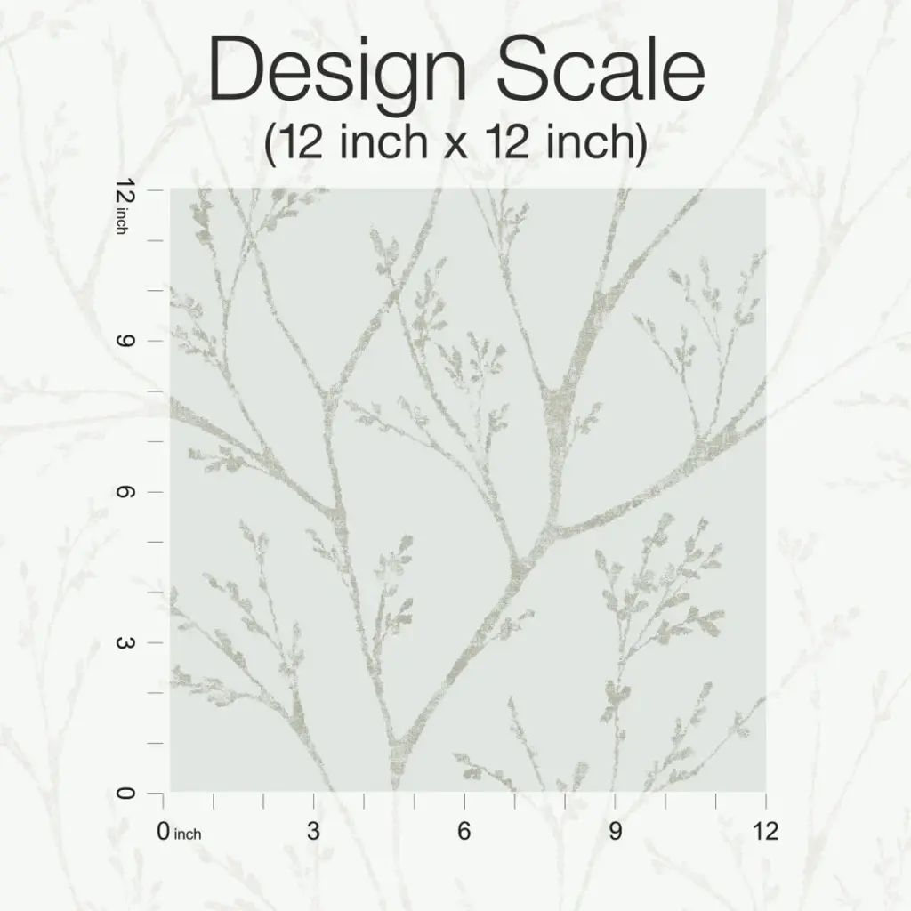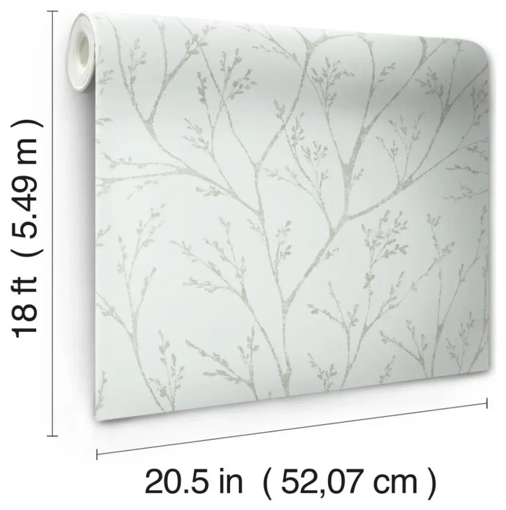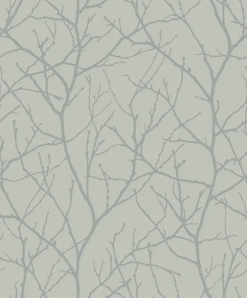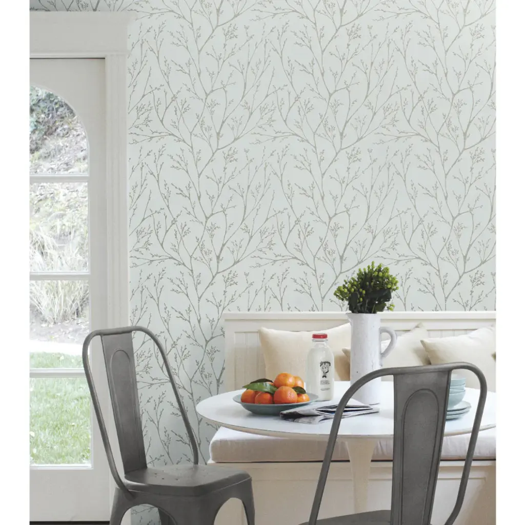 These stamp inked style gently swaying tree branches, tipped with first bloom leaves, stand in restful silhouette against a clean background in this Tree Branches peel and stick wallpaper from RoomMates.