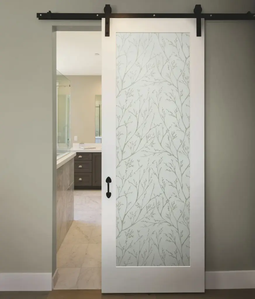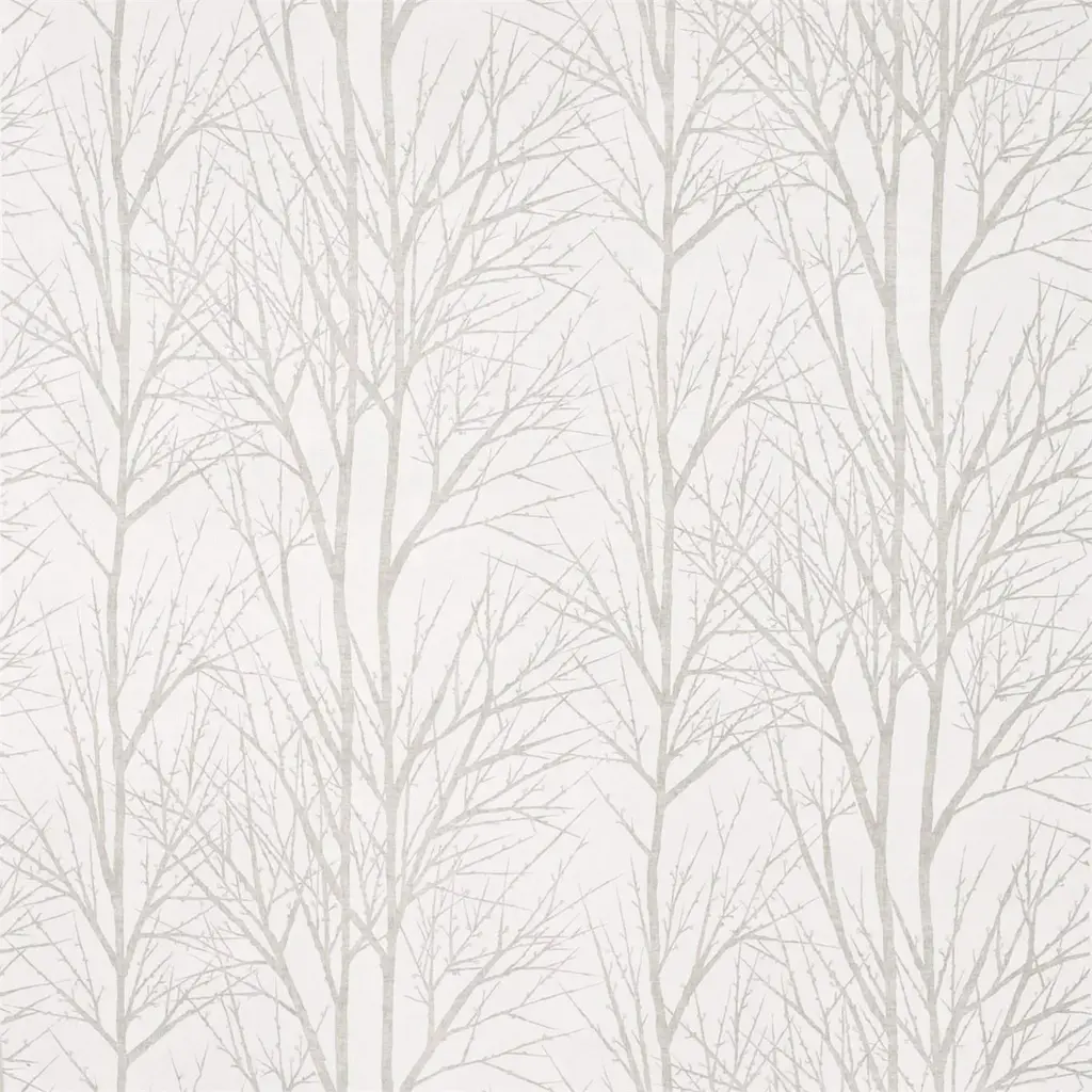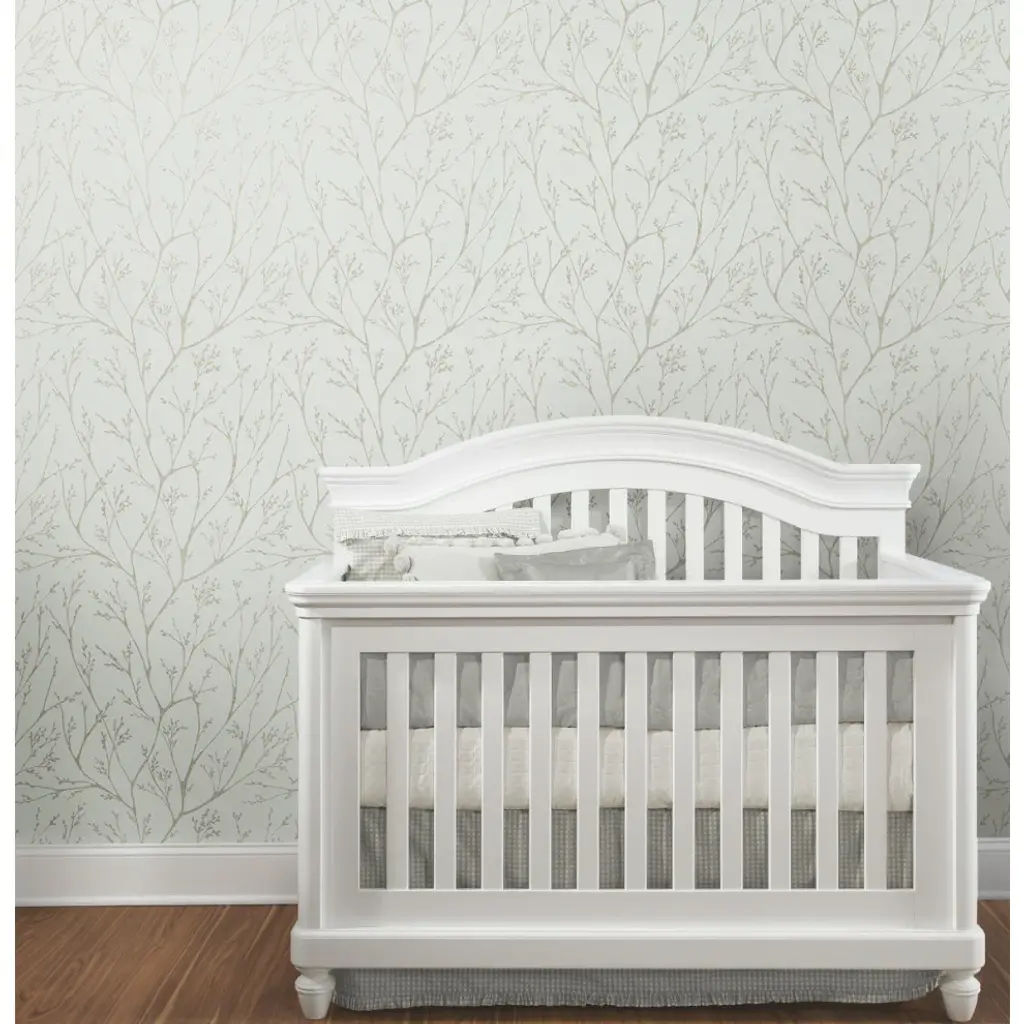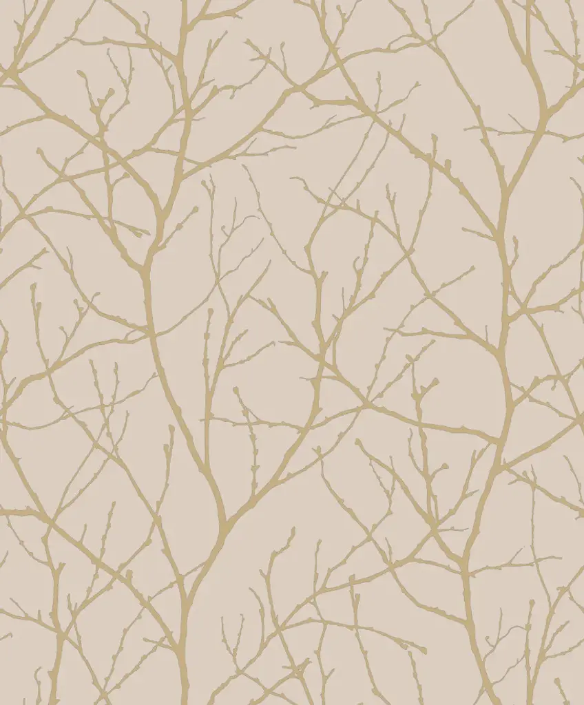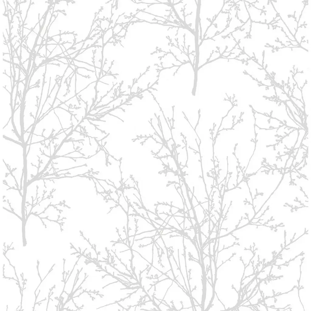 These stamp inked style gently swaying tree branches, tipped with first bloom leaves, stand in restful silhouette against a clean background in this Tree Branches peel and stick wallpaper from RoomMates.