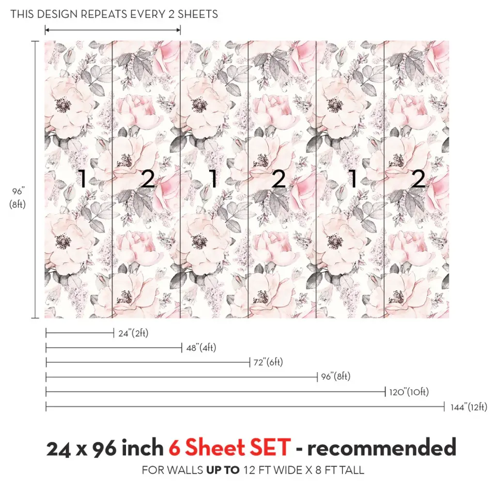 Blush Flower Mural Peel And Stick Vinyl Wallpaper, Pink, 24"w X 96"h, 6 Sheet Set