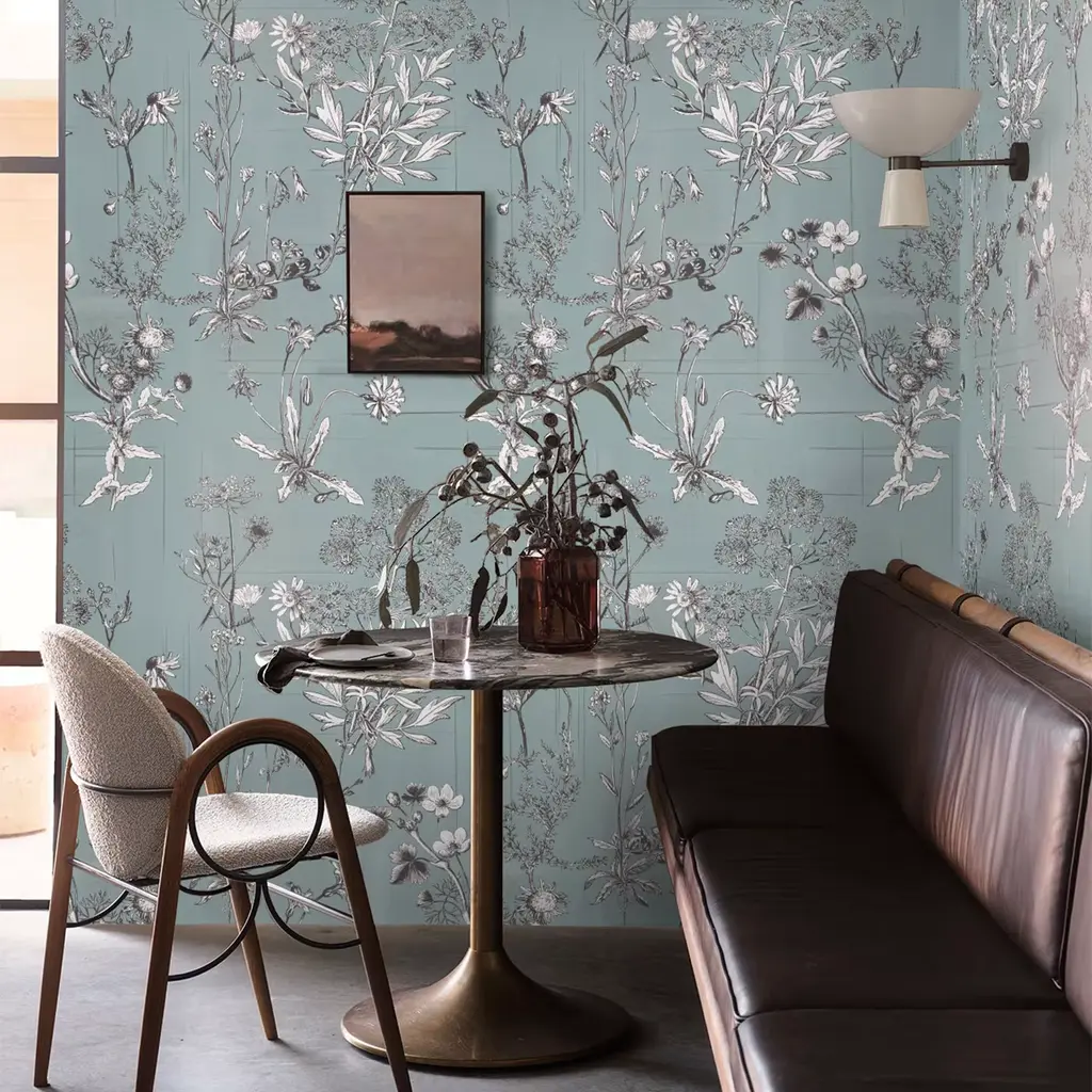 Eco-friendly wallpaper made of 100% ecological paper, painted with vegan water-based inks, and free of chemicals. Designed and printed in Italy, it's easy to apply and remove with hot water. Featuring hand-drawn wildflowers like daisies, poppies, and tulips in soft monochromatic shades, it brings Boho charm to any room, ideal for creating a fresh, feminine update or playful decor. Each pack includes 8 sheets. Each sheet measures 27.5x39.4 inches/70x100 cm, covering a total area of 5 MQ.