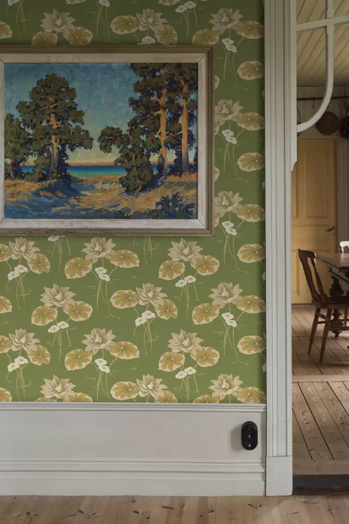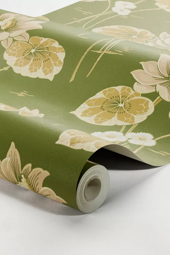 Inspired by a pattern from the early 20th century, Haga in Leaf is an enchanting wallpaper that illustrates a specific interior design savvy. With beige, pinky waterlilies and an olive green backdrop, its a bold botanical expression that adds romance and wonder to any space. Created by the historic Scandinavian brand, Borstapeter, Schumacher distributes it in the US. * Paper* Spot Clean Only* Country of Origin: Sweden#### *Dimensions** Item Width: 21"* Vertical Repeat: 15* Match: Straight* Sold As: 11-Yard Roll* Covers 57.75 square feet