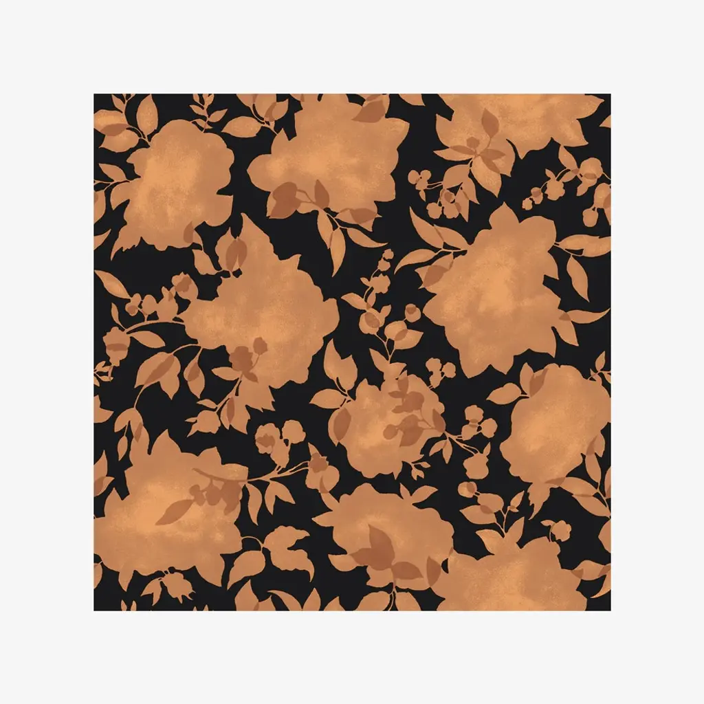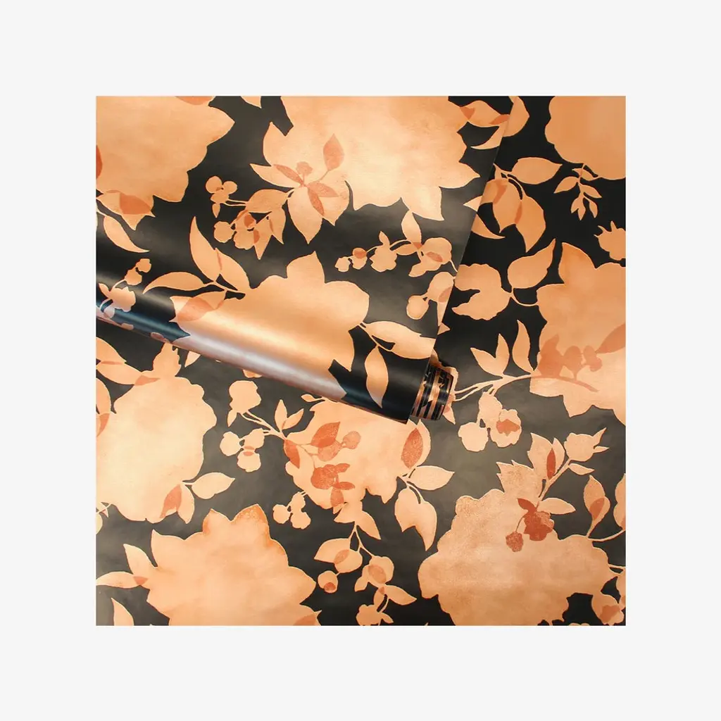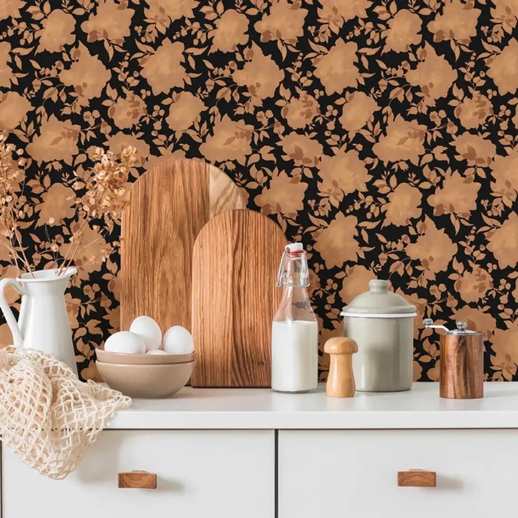 Bring opulence and glamour to your walls with this luxe floral wallpaper, in a moody copper and black colorway.