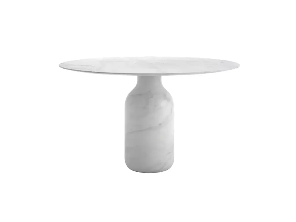 The Bottle table, originally designed by British designers Edward Barber and Jay Osgerby in 2007 and winner of the prestigious Wallpaper* Design Award in the same year, gets back into the Cappellini catalogue in the version with a round tabletop, slightly tapered to create an effect of extreme visual lightness. The base clearly recalls the shape of a bottle, hence the name of the product.Crafted entirely from white Carrara or black Marquinia marble, the Bottle table is also available in a bi-colour version, combining the two marble colours shades for the top and the base.