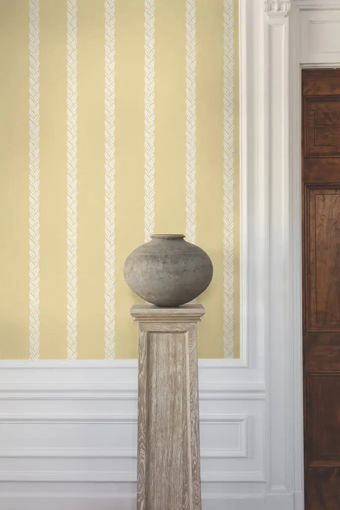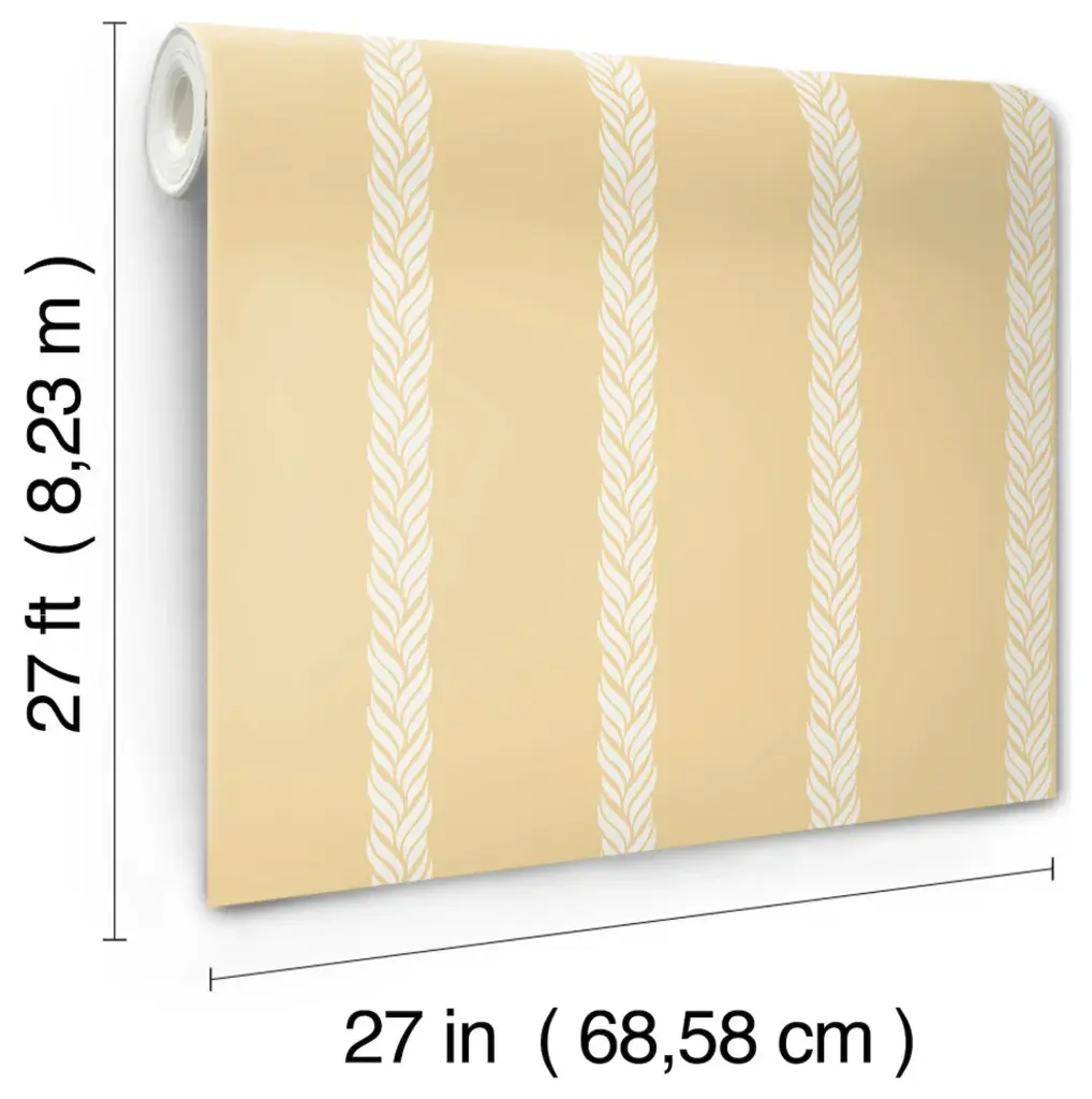 The silhouette of a deeply textured broad Braided Stripe is printed to emulate a hand-painted artisan application, shown here in white on straw yellow. This Braided Stripe Wallpaper measures approximately 27 inches wide by 27 feet long, measuring approximately 60.8 square feet per roll. The distinction of timeless style. Unpasted non woven material. 20.5-in repeat, straight match. Washable and strippable. 27-in by 27-ft long roll. Covers about 60.8 square feet