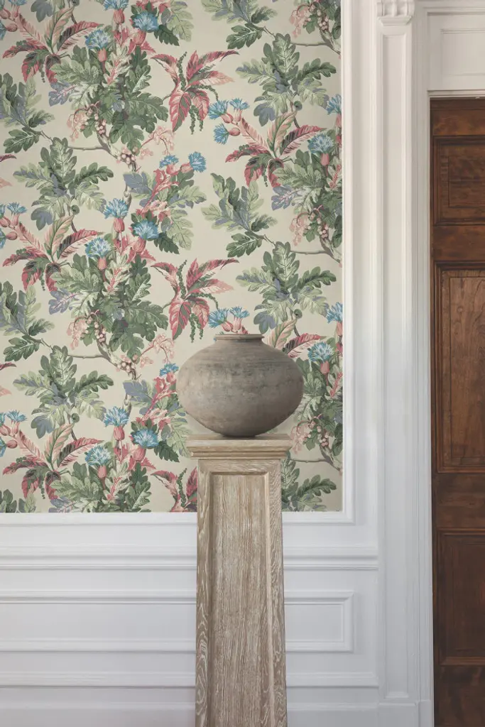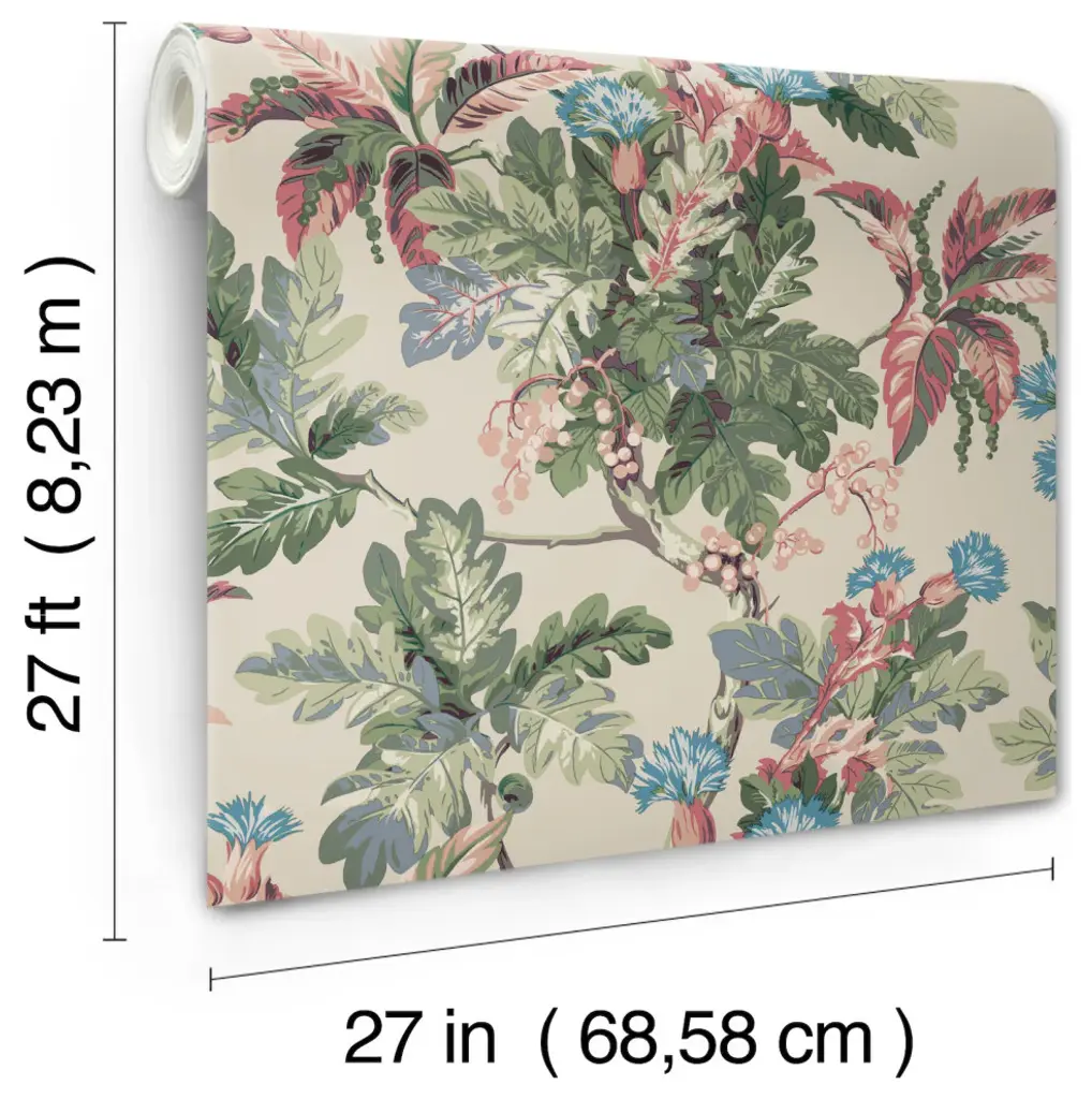 The great European manor house inspires the lush greenery, berries, and vines of the botanical pattern Briarwood, shown in taupe brown with green ans pink. This Briarwood Wallpaper measures approximately 27 inches wide by 27 feet long, measuring approximately 60.8 square feet per roll. The distinction of timeless style. Unpasted non woven material. 25.25-in repeat, drop match. Washable and strippable. 27-in by 27-ft long roll. Covers about 60.8 square feet