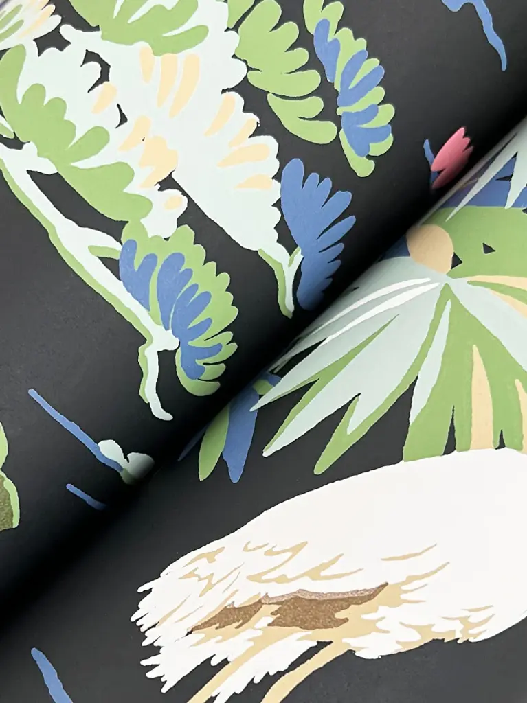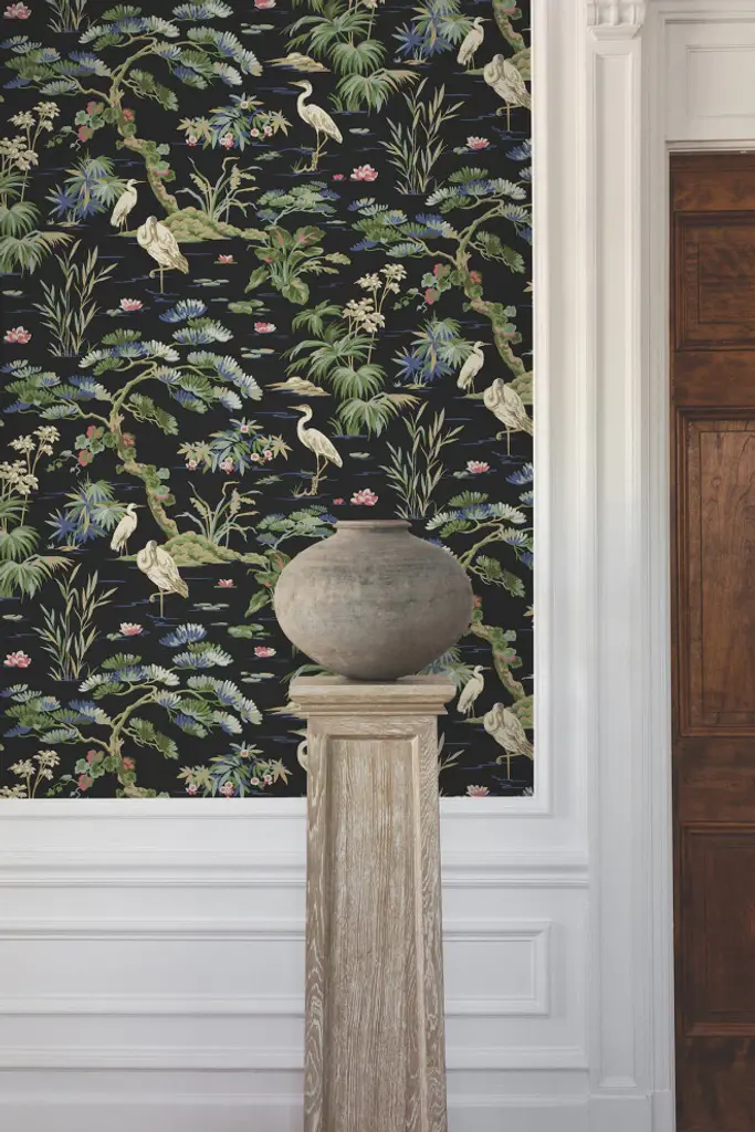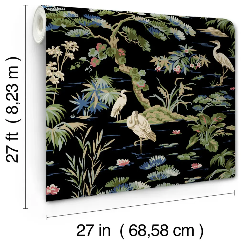 Herons and cranes rest between the lotus blossoms and Matsu trees in Bridgewater''s stylized rendering of Asian wetlands, shown here in jet black with blue, green, and pink. This Bridgewater Wallpaper measures approximately 27 inches wide by 27 feet long, measuring approximately 60.8 square feet per roll. The distinction of timeless style. Unpasted non woven material. 25.25-in repeat, drop match. Washable and strippable. 27-in by 27-ft long roll. Covers about 60.8 square feet