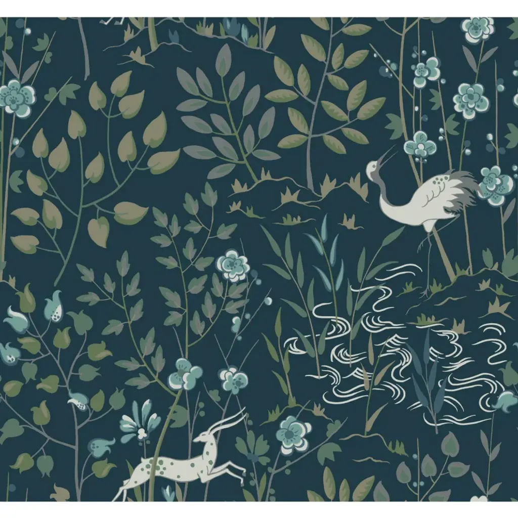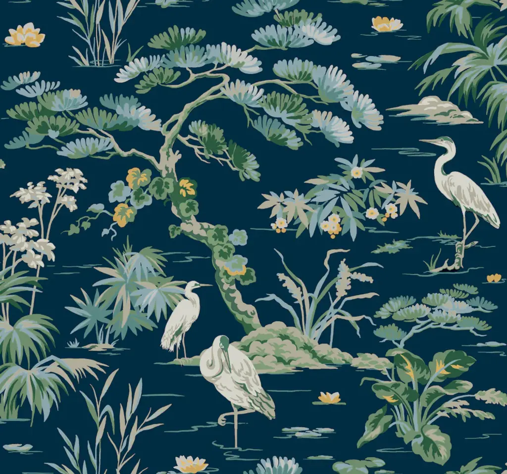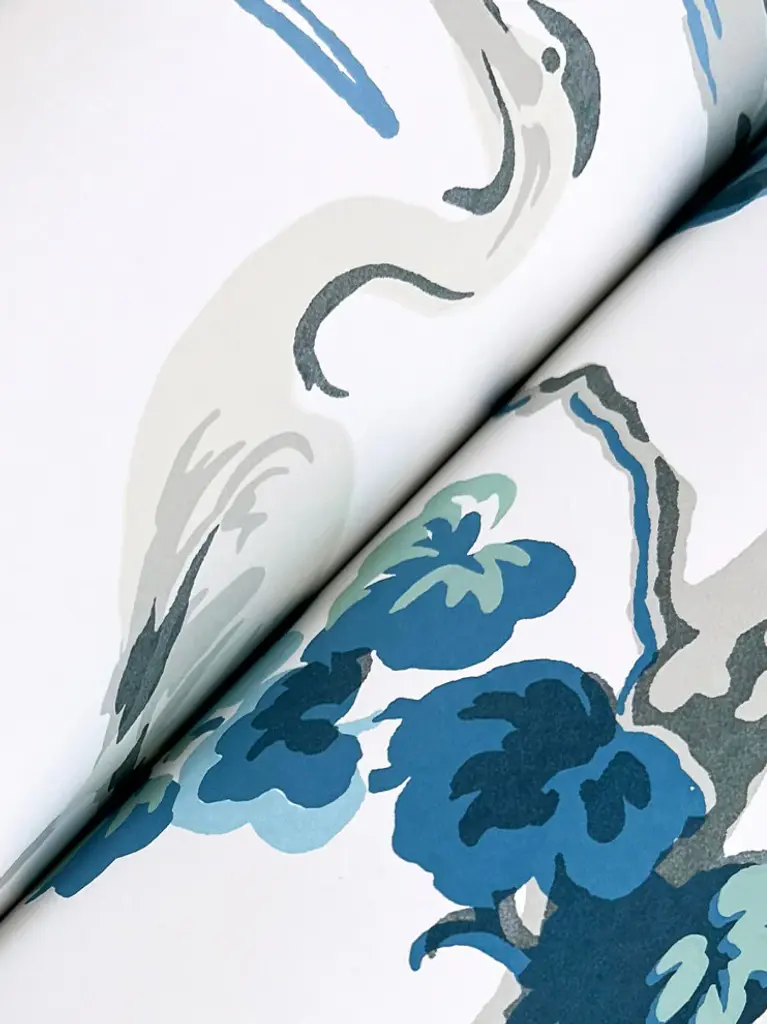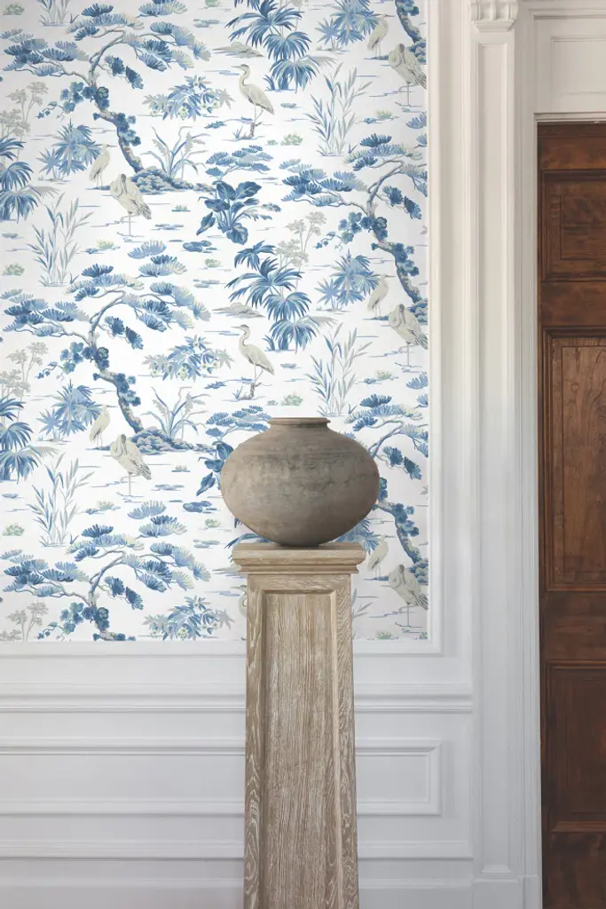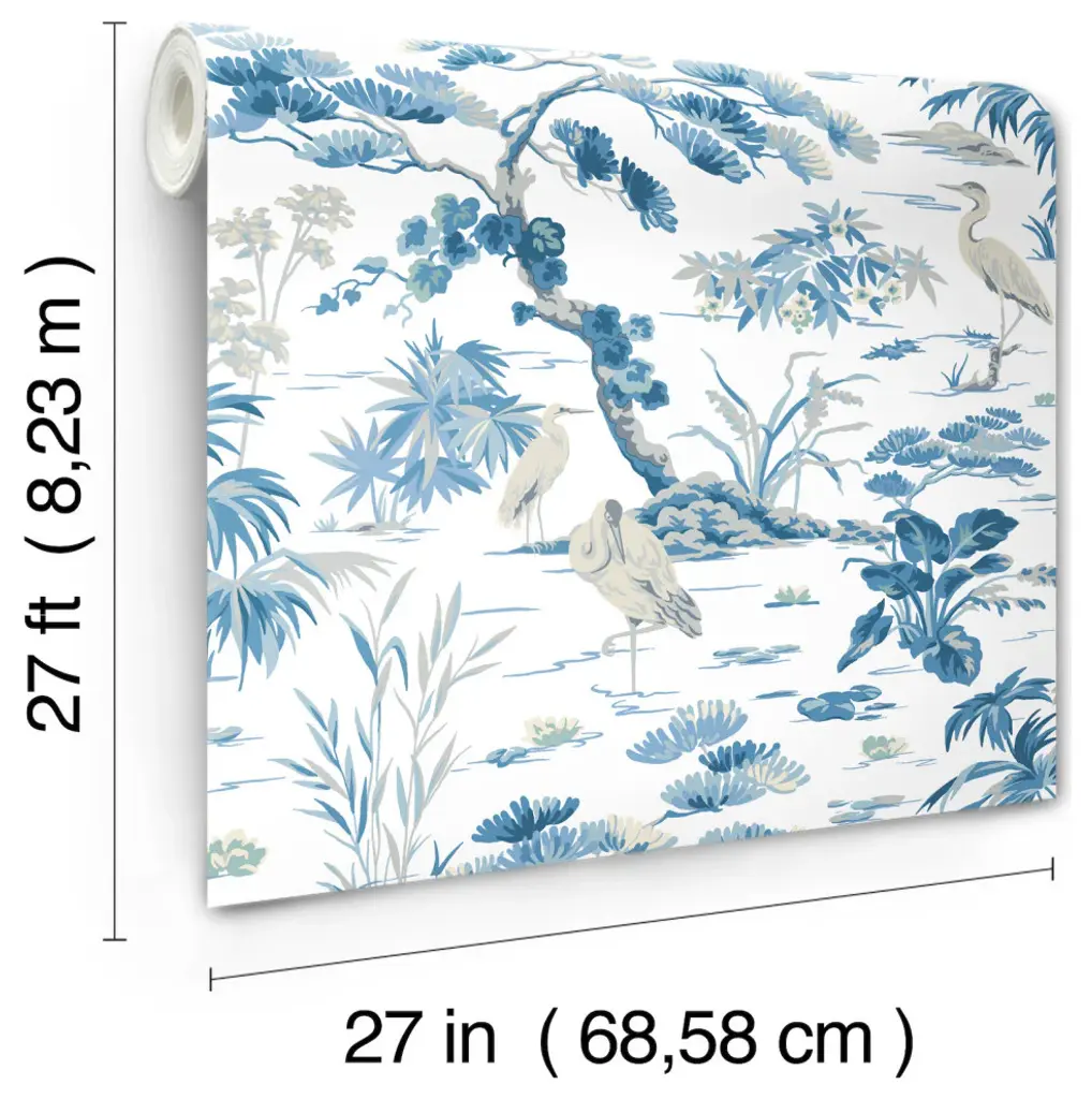 Herons and cranes rest between the lotus blossoms and Matsu trees in Bridgewater''s stylized rendering of Asian wetlands, shown here in Ming blue on white. This Bridgewater Wallpaper measures approximately 27 inches wide by 27 feet long, measuring approximately 60.8 square feet per roll. The distinction of timeless style. Unpasted non woven material. 25.25-in repeat, drop match. Washable and strippable. 27-in by 27-ft long roll. Covers about 60.8 square feet