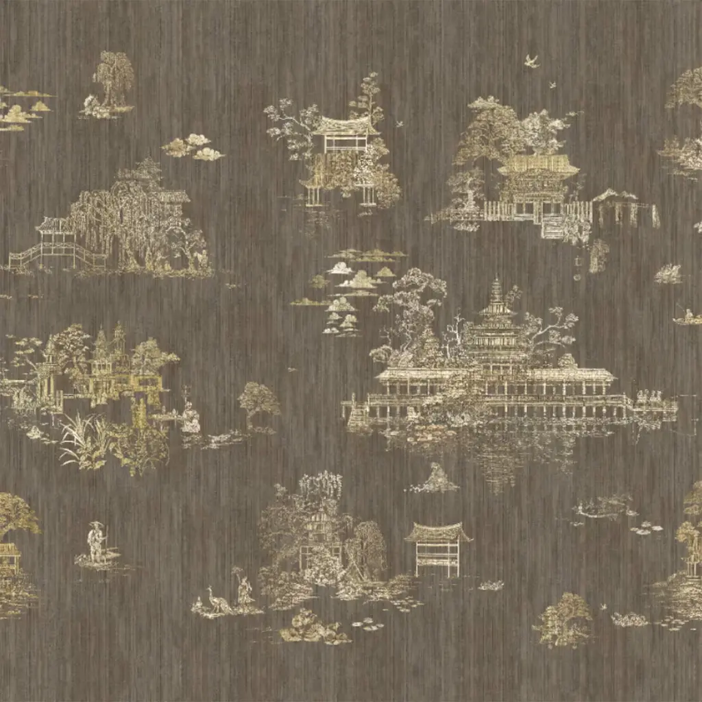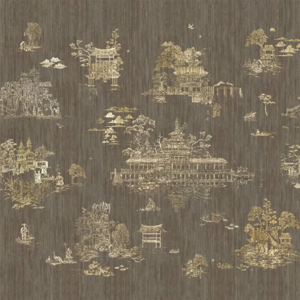 The Brown & Gold Hours & Blinks Polyester Wallcovering Fabric features intricate scenes of tranquil life set against a mesmerizing backdrop. Inspired by the elegance of Japanese decoration and 12th-century lacquered artifacts, the design utilizes gold leaf accents to accentuate its luxurious details. This fabric exhibits delicate shadows and light effects, offering a three-dimensional appearance. The color palette includes classic yet bold hues of gold and lacquer, alongside modern pearly pastel options, ensuring a versatile fit for diverse decor styles. The double-width design allows for seamless installations that achieve a sophisticated and continuous appearance. This piece provides customization options to fit various wall sizes and layouts and is available in an alternative height of 270 cm. The price is per square meter. Please contact the Concierge for additional information.