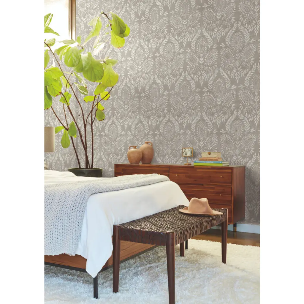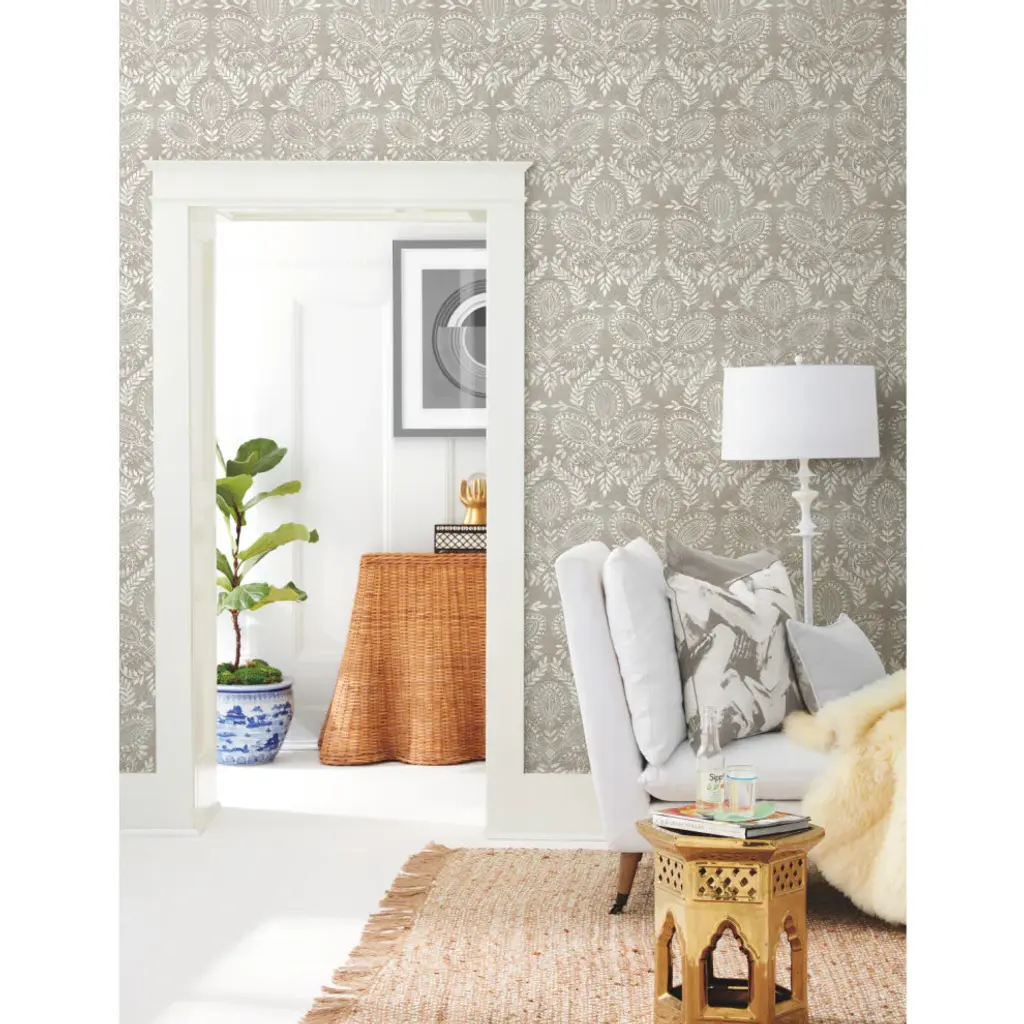 An artist''s vision of laurel branches, rendered in watercolor on a mottled ground, forms the painterly effect of pattern Laurel Damask. This Laurel Damask Wallpaper measures approximately 27 inches wide by 27 feet long, covering About 60.8 square feet per roll. Durable and easy to remove from primed walls, this friendly to hang unpasted nonwoven wallpaper is created with a special blend of synthetic fibers, making it both easy to hang and tear resistant. Unpasted non woven material; 24-in repeat, straight match; Washable and strippable; 27-in by 27-ft long roll; Covers about 60.8 square feet