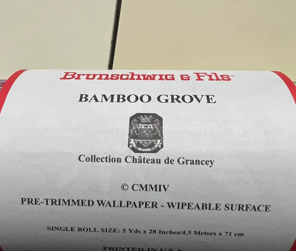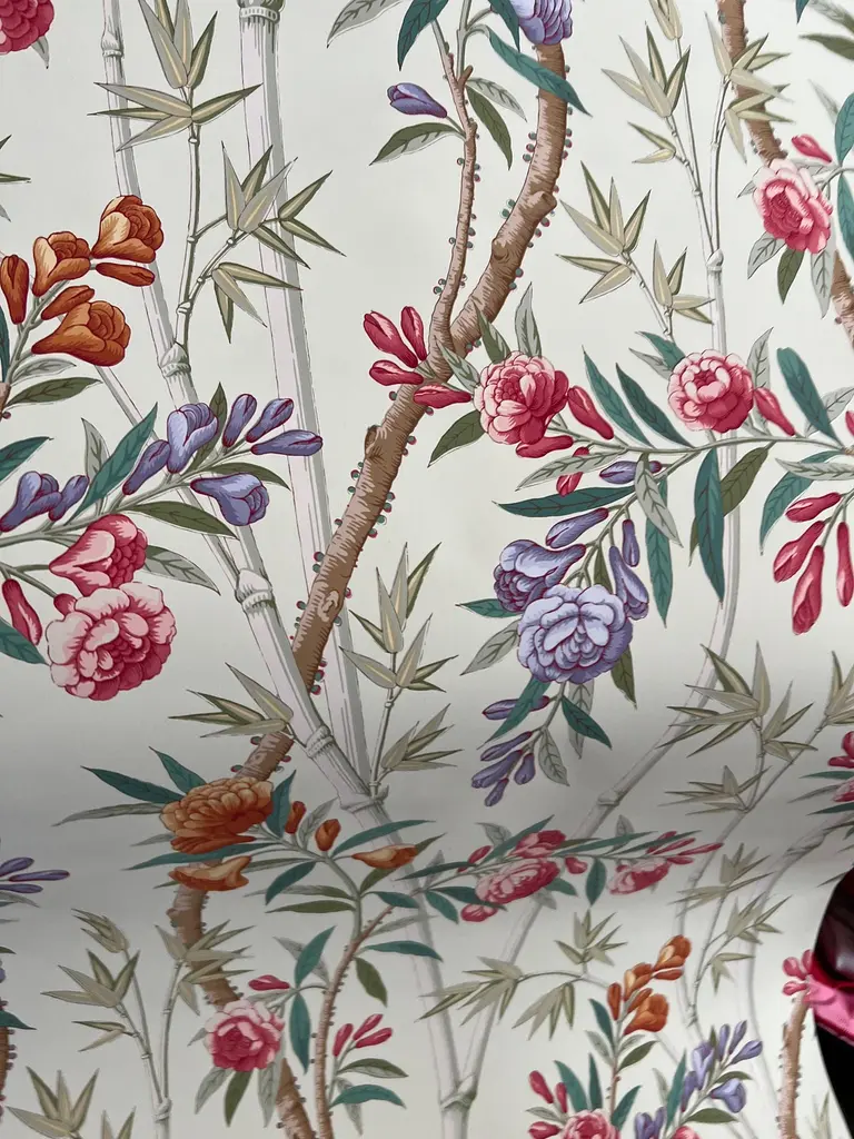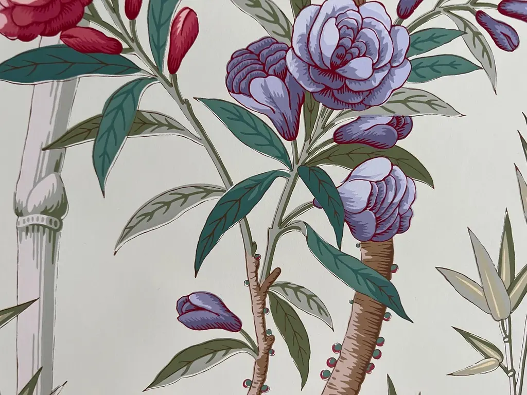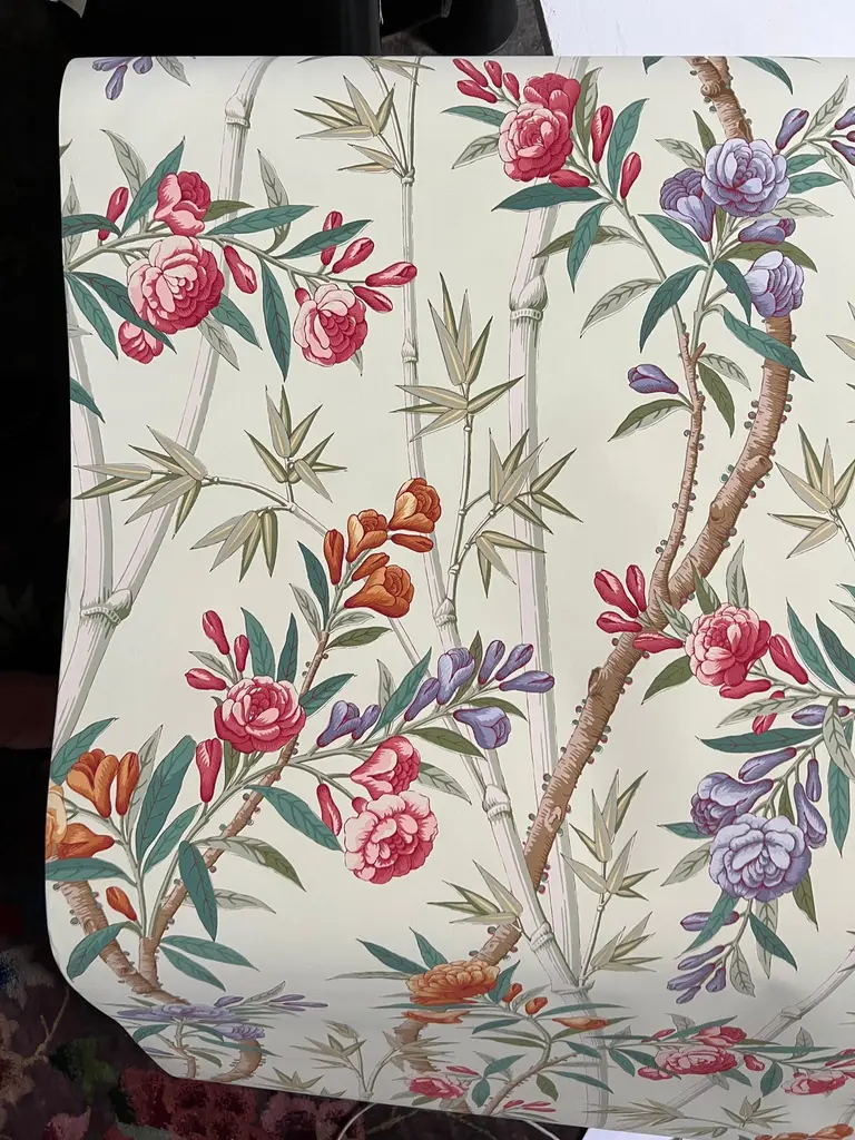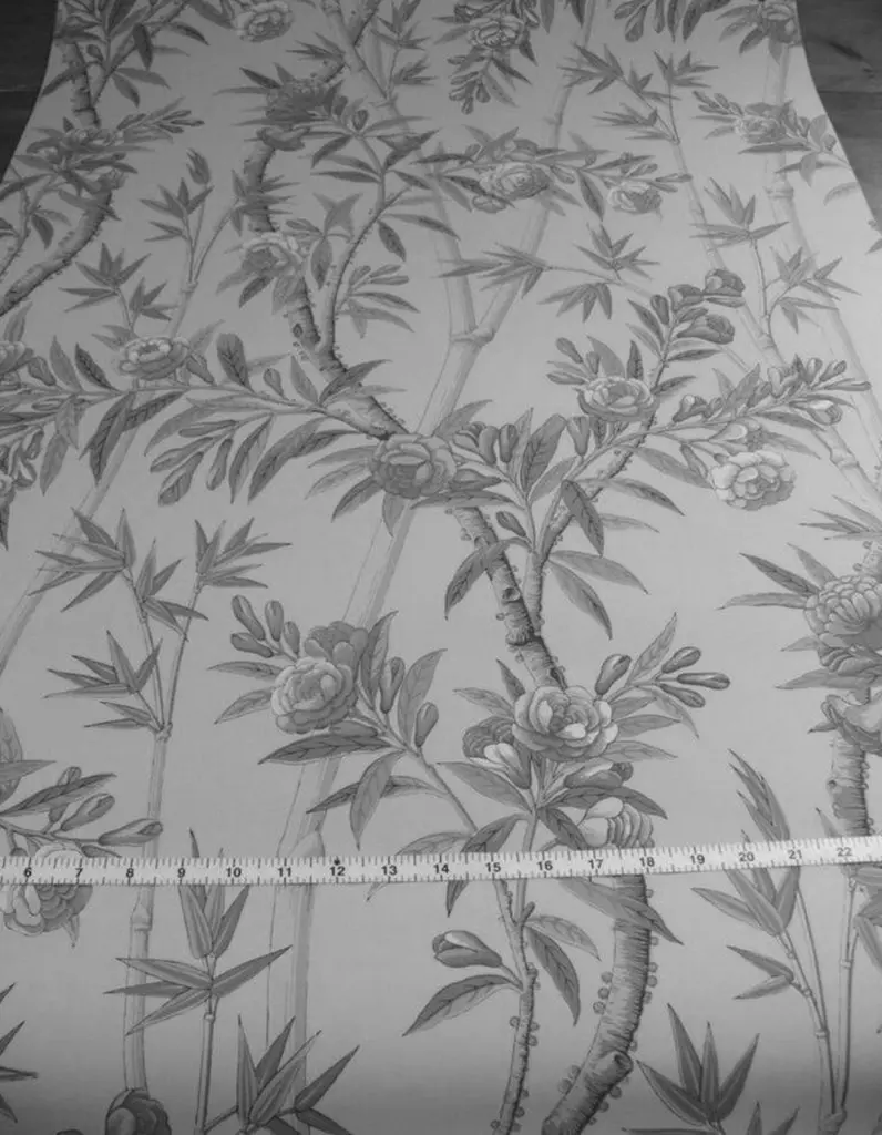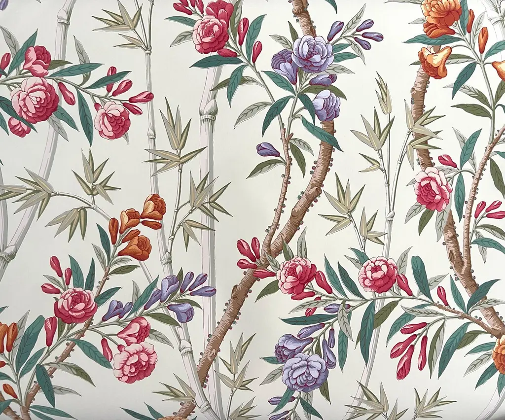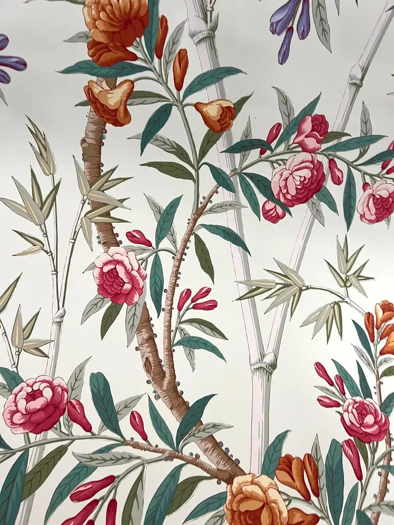 Brunschwig and Fils bamboo grove handprinted floral wallpaper, Celadon Cream, USA. Listing is for a triple roll (15 yards x 36”). Gorgeous chinoiserie print. No longer in production.