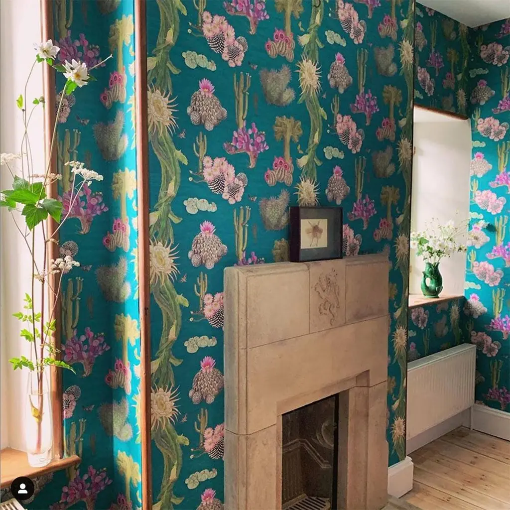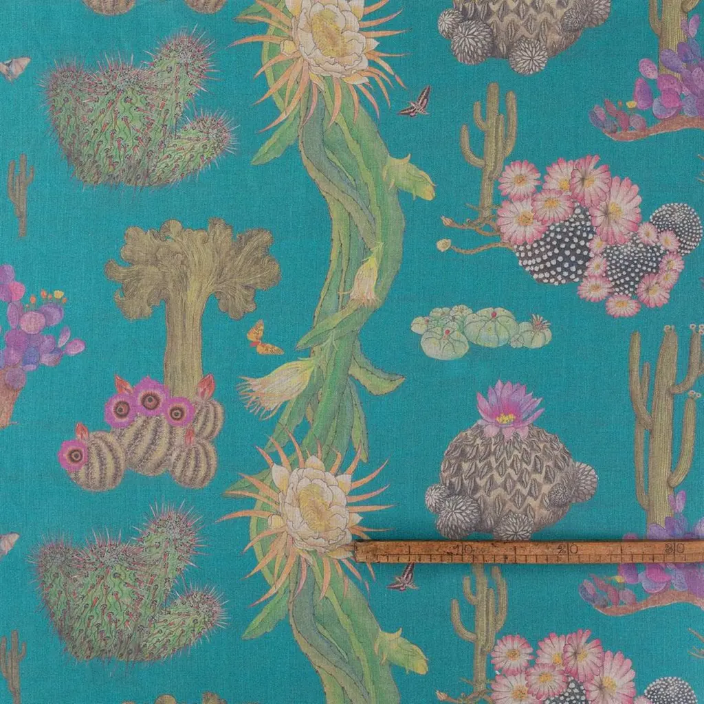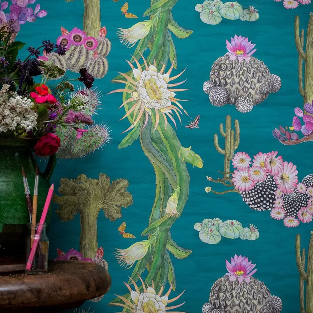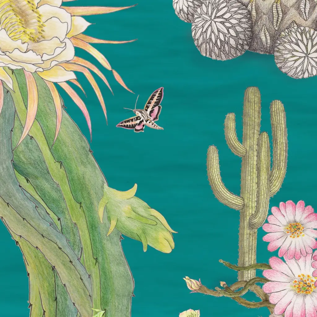 Collection: Cactus MexicanosProduct Code: 33CColor: TurquoiseRoll dimensions: 70cm x 10m (27.6in x 10.9yards)Area: 7sq.m (8.4 sq.yards)Pattern repeat: Half-dropVertical repeat: 46.7cm (18.4in)Wallpaper: Non-woven 147gsm UncoatedFire rating: Fire certified for both Europe and the USA. Classified to BS En 13501-1-1:2002, class B, s1, d0This design is the culmination of several years Dr Susy Paisley spent living in, and besotted with, Mexico. It celebrates the incredible diversity of Mexican cacti. Mexico is one of the world's centre of endemism for this group of plants, and includes marvels like the Creeping Devil, a cactus in this design which actually moves across the desert floor! Cacti are enjoying a new popularity, but globally, one out of three cacti is in need of conservation attention. The design includes the Chisos Moungtain hedgehog cactus, hallucoinogenic Peyote, a critically endangered dragonfruit, which forms the long tendrils in the design, and lesser long-nosed bat (an essential pollinator for cacti) and the iconic saguaro and crested saguaro cacti. These unusual forms give the design a contemporary feel, and the pops of magenta, a common flower colour for this group, give great vibrancy to the design. With exquisite botanical detail, it builds on the passion in interiors for honouring the natural world. Furthermore, for every roll of wallpaper sold, 100m2 of critical wild Habitat is preserved through World Land Trust. This is an eco-friendly fine gicleé digitally-printed “real” wallpaper. It is printed in the UK on a natural non-woven cellulose-based substrate made from recycled materials – recycled polyester (PET) fibre and recycled wood pulp. The production process is solvent free with minimal waste and energy inputs.