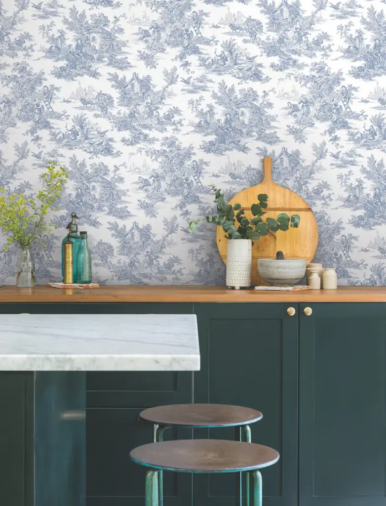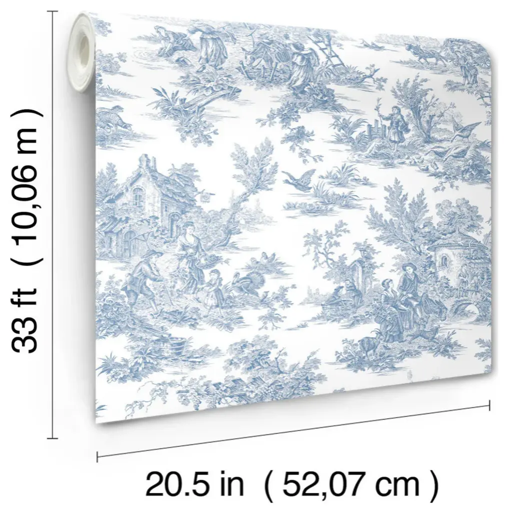 Campagne Toile''s serene pastoral harvest scenes are lovingly illustrated in periwinkle-blue ink against a white backdrop. This Campagne Toile Wallpaper measures approximately 20.5 inches wide by 33 feet long, measuring approximately 56.4 square feet per roll. The quintessential design for timeless romance, toile traces its origins to 18th century fabrics. This celebrated motif is explored with a range of classical reproductions and modern reimaginings. Prepasted sure strip material; 20.5-in repeat, drop match; Washable and strippable; 20.5-in by 33-ft long roll; Covers about 56.4 square feet