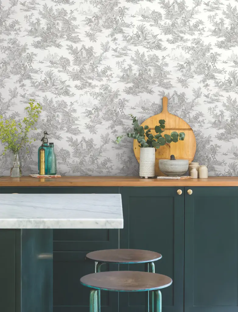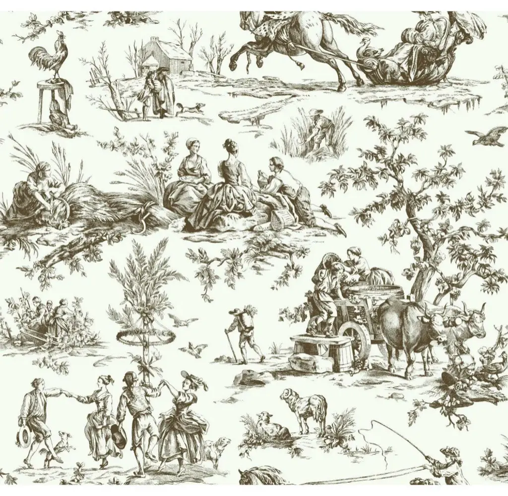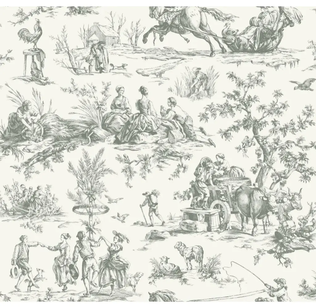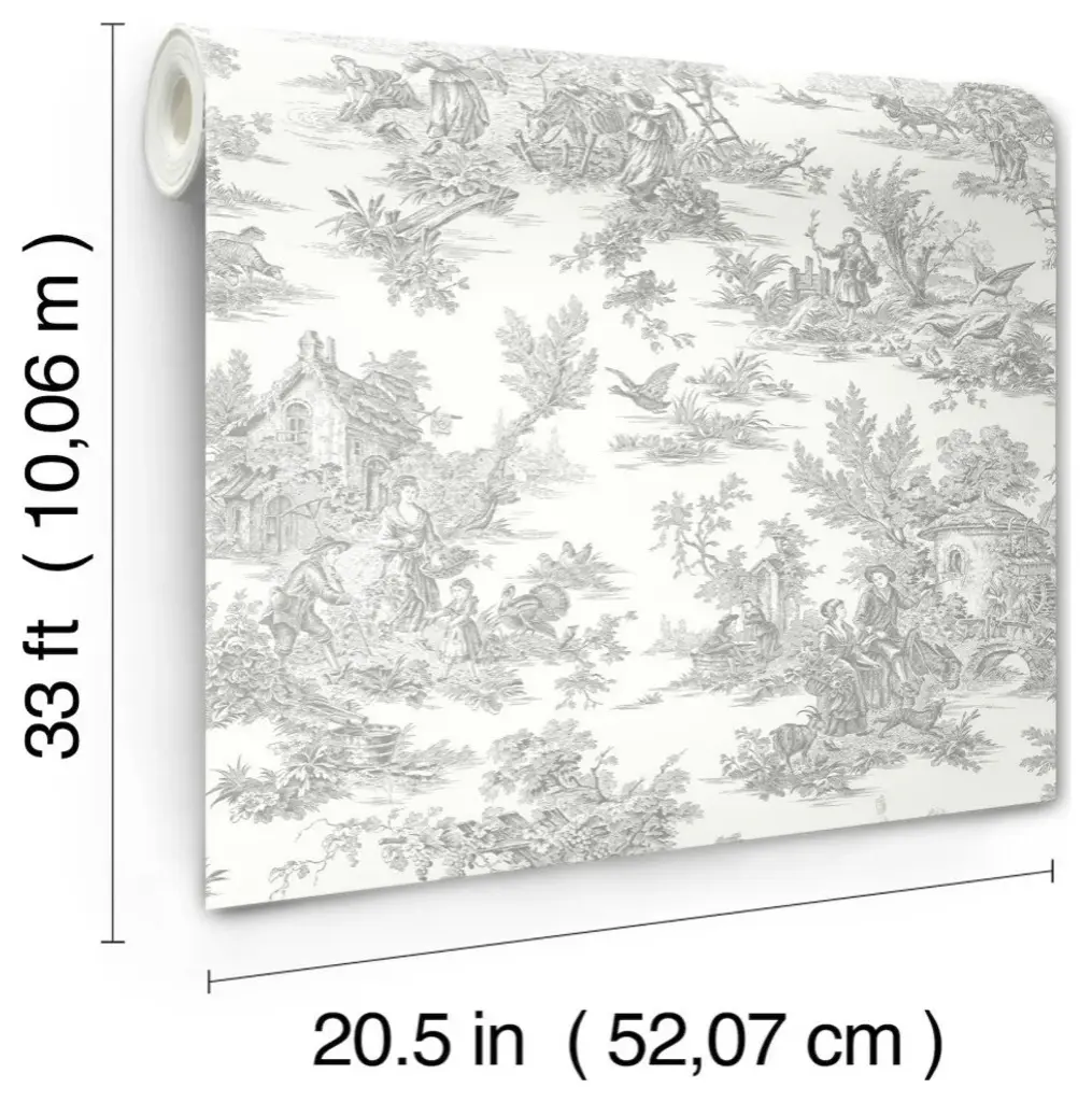 Campagne Toile''s serene pastoral harvest scenes are lovingly illustrated in silver-grey ink against a white backdrop. This Campagne Toile Wallpaper measures approximately 20.5 inches wide by 33 feet long, measuring approximately 56.4 square feet per roll. The quintessential design for timeless romance, toile traces its origins to 18th century fabrics. This celebrated motif is explored with a range of classical reproductions and modern reimaginings. Prepasted sure strip material; 20.5-in repeat, drop match; Washable and strippable; 20.5-in by 33-ft long roll; Covers about 56.4 square feet