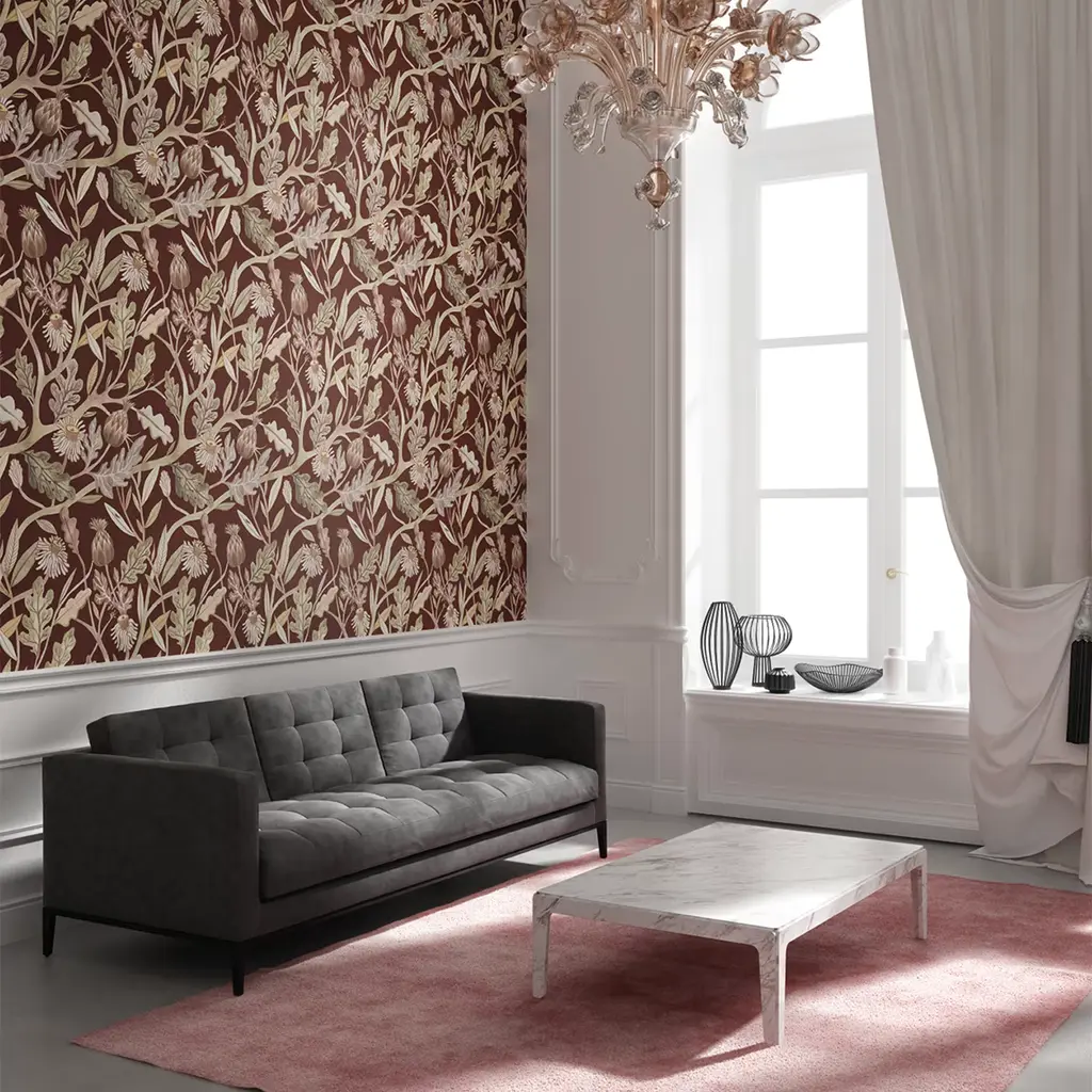 Pricing is per square meter. Cardoon flowers stems, and leaves make up a refined bouquet in a wallpaper designed by Francesca Greco on sinuous organic geometric patterns. Available in three colors. Please contact the concierge service for further information.