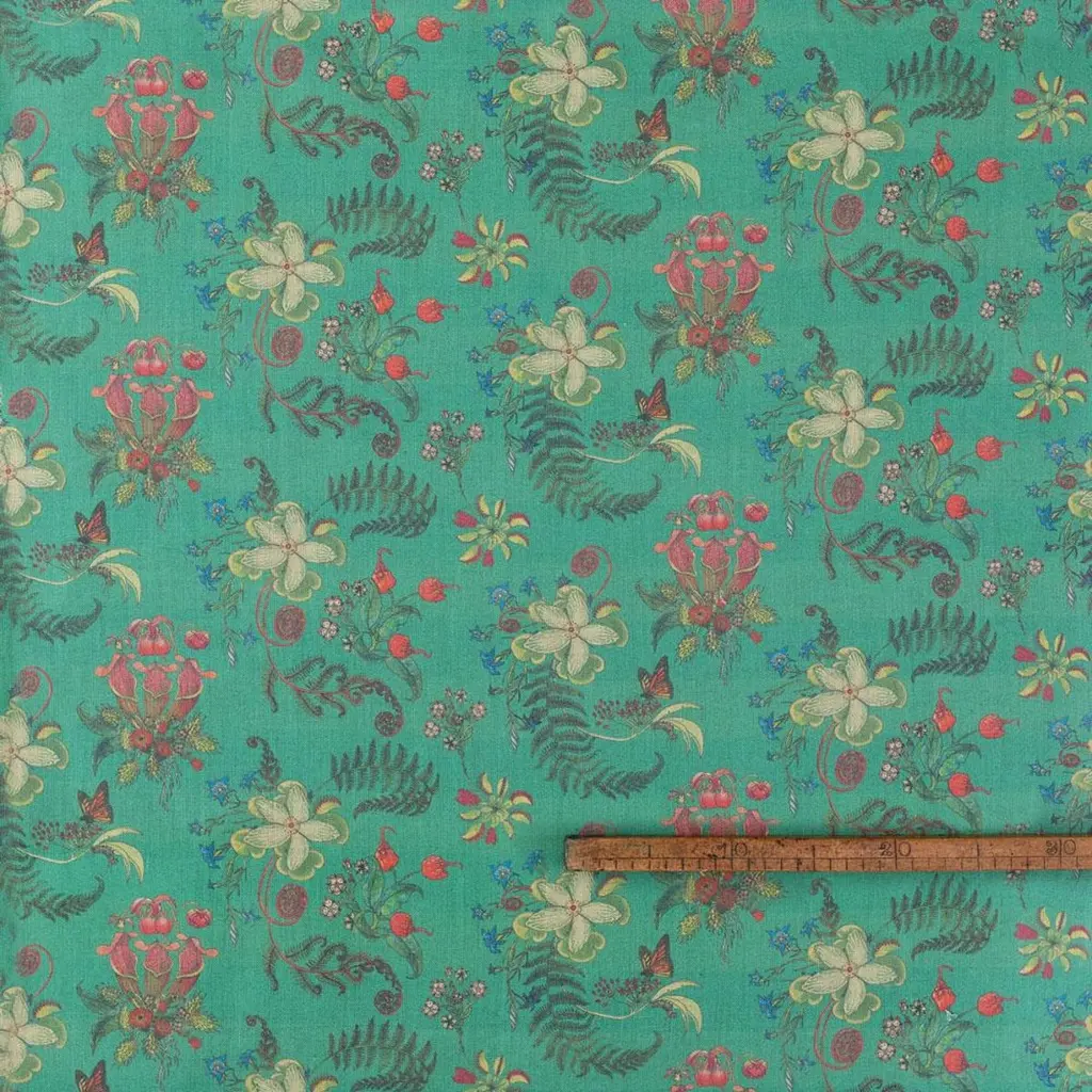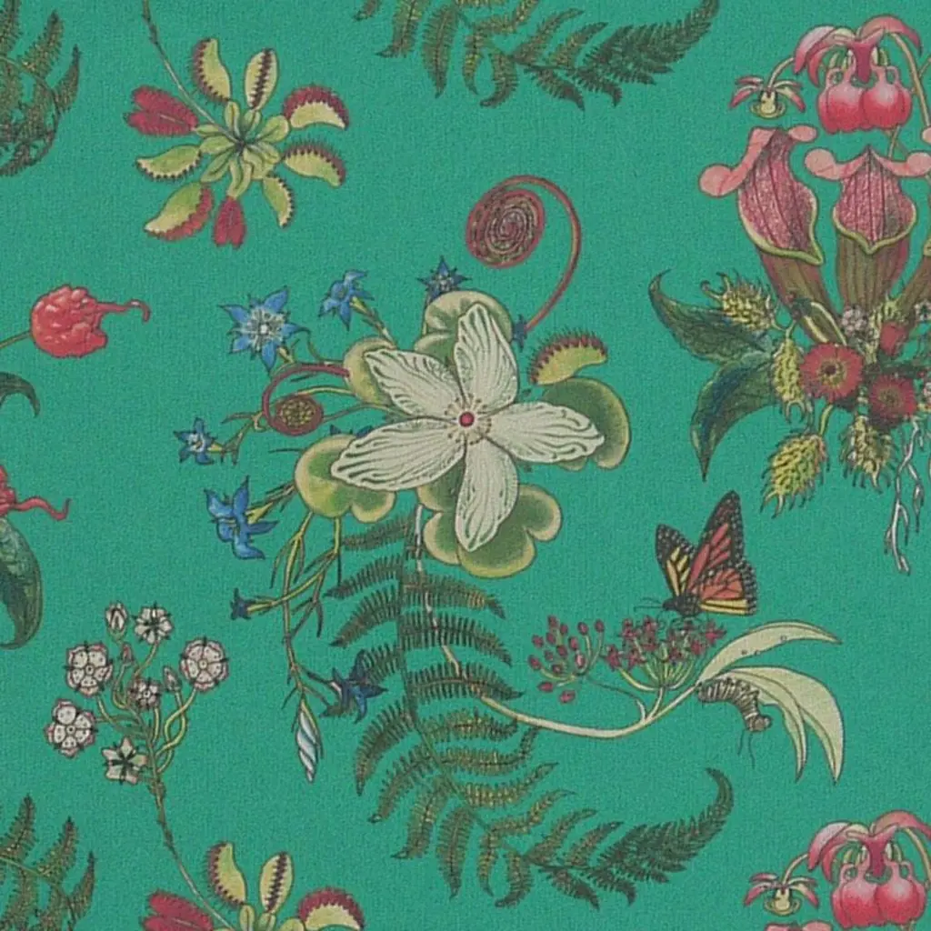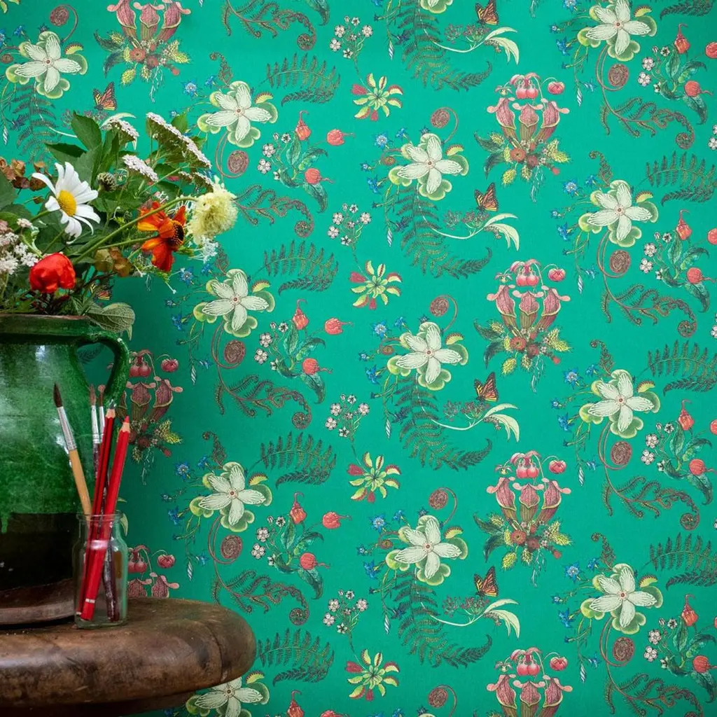 Collection: Carolina PosiesProduct Code: 26FColor: JadeRoll dimensions: 70cm x 10m (27.6in x 10.9yards)Area: 7sq.m (8.4 sq.yards)Pattern repeat: 17.5cm (6.9in) Half DropWallpaper: Non-woven 147gsm Uncoated. Fire rating: Fire certified for both Europe and the USA. Classified to BS En 13501-1-1:2002, class B, s1, d0.Carolina Posies is a lush, hand-drawn design which celebrates wild species of the Southern States of the Carolinas. The designer is a conservation biologist who grew up in this beautiful area. The rich colors and graphic details are matched by the interest of the many extraordinary species depicted, including monarch butterflies and their larval food-plants, milkweed, Carolina Reaper chilli peppers, devil's paintbrush, pine barren gentian, grass of Parnassus and carnivorous plants.Carolina Posies is a detailed botanical part of a growing passion in interiors for honoring the natural world. Furthermore, for every roll of wallpaper sold, 100m2 of critical wild habitat is preserved through World Land Trust.This is an eco-friendly fine gicleé digitally-printed “real” wallpaper. It is printed in the UK on a natural non-woven cellulose-based substrate made from recycled materials, recycled polyester (PET) fibre and recycled wood pulp. The production process is solvent free with minimal waste and energy inputs.