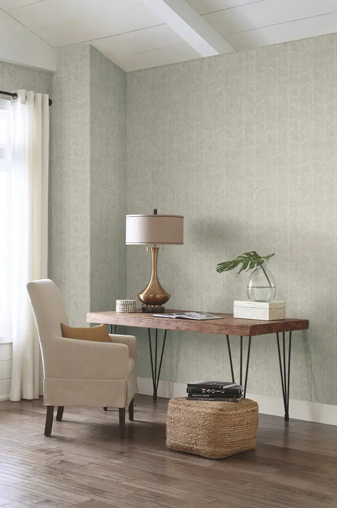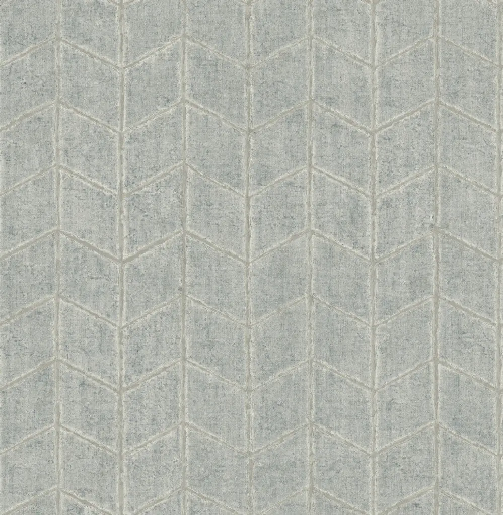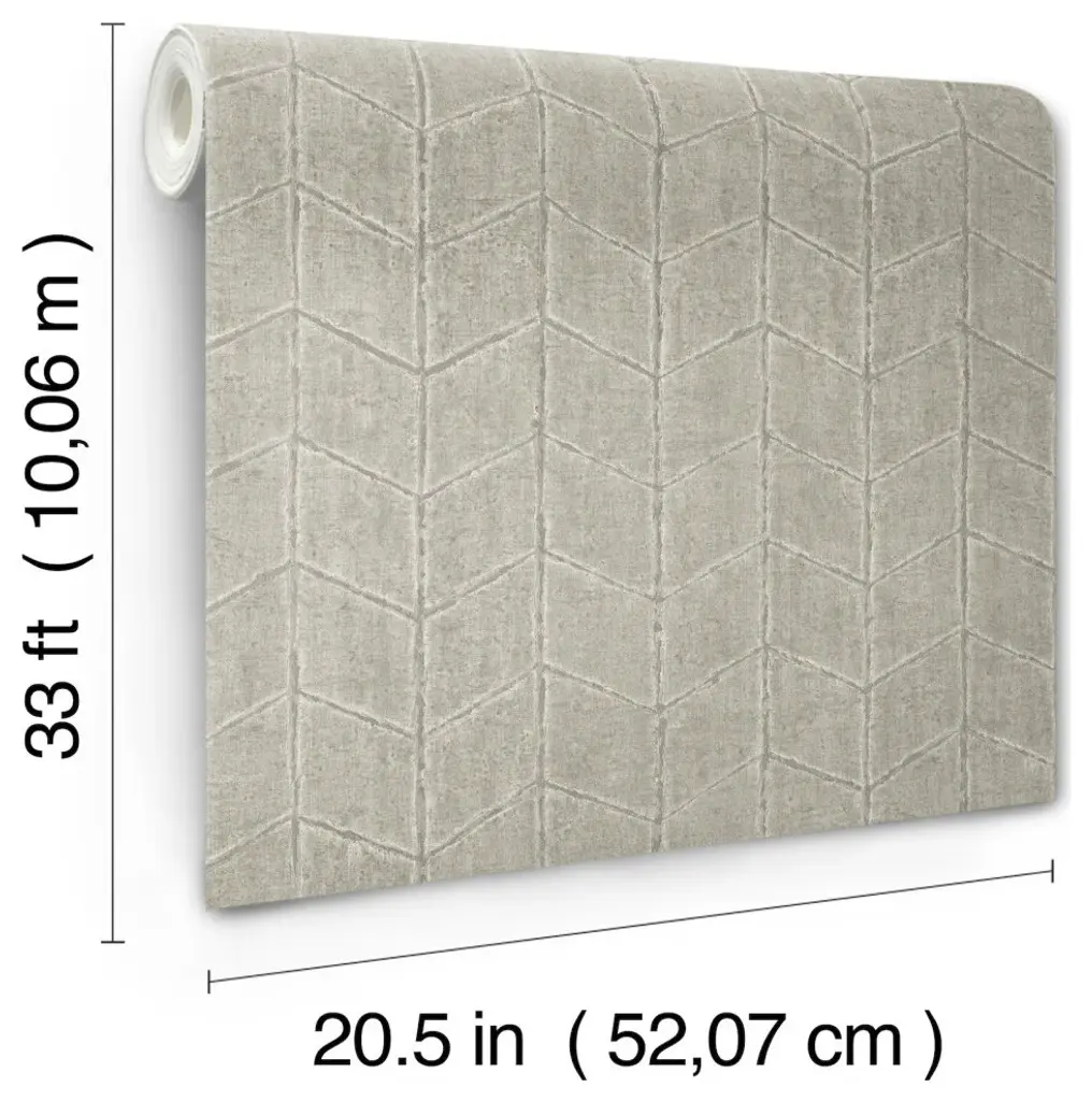 The chevron gets a modern, industrial upgrade when stylized with raised textural plaster relief and metallic in the pattern Flatiron Geometric, shown in cement gray with charcoal gray. This Flatiron Geometric Wallpaper measures approximately 20.5 inches wide by 33 feet long, measuring approximately 56.4 square feet per roll. The modern aesthetic of natural form. Unpasted non woven material20.5-in repeat, straight matchWashable and strippable20.5-in by 33-ft long rollCovers about 56.4 square feet