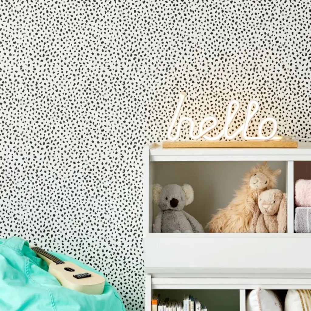Instantly give any kids room a modern upgrade with this White and Black Speckle Removable Wallpaper. The freehand dot pattern will fit right into stylish, contemporary girls bedrooms and boys bedrooms. The black and white color scheme goes with just about everything, and the wallpaper is low-commitment since it's so easy to stick up or remove. Plus, you can even get creative and apply it to dressers, cabinets and more.
