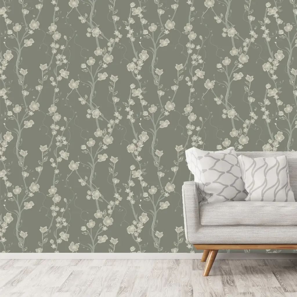 Cherry Blossom Vintage Olive Wallpaper By Monor Designs, 24"x72"