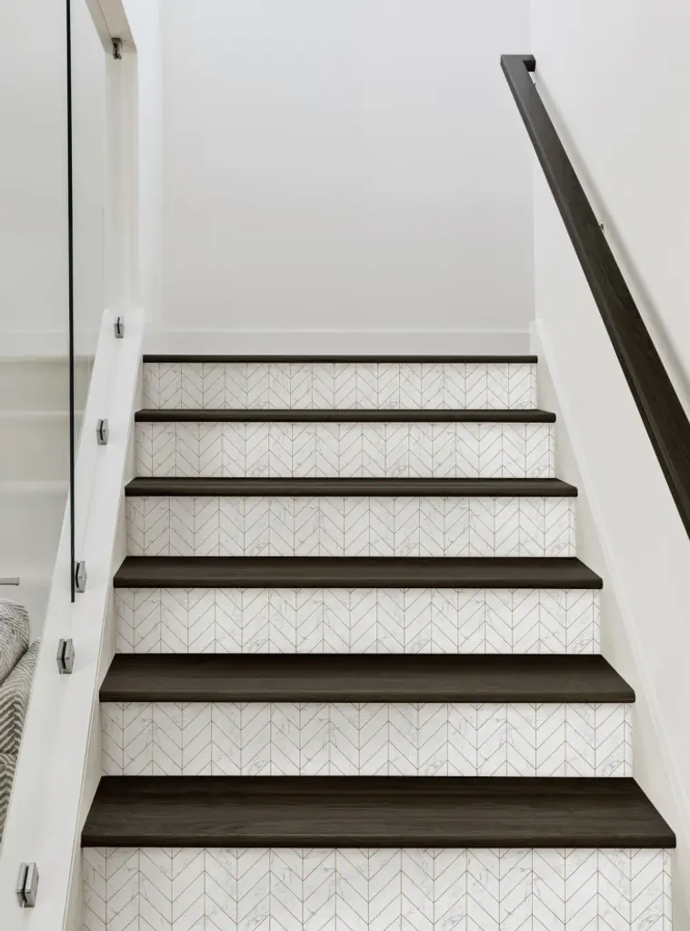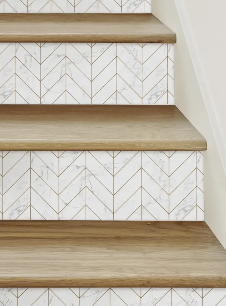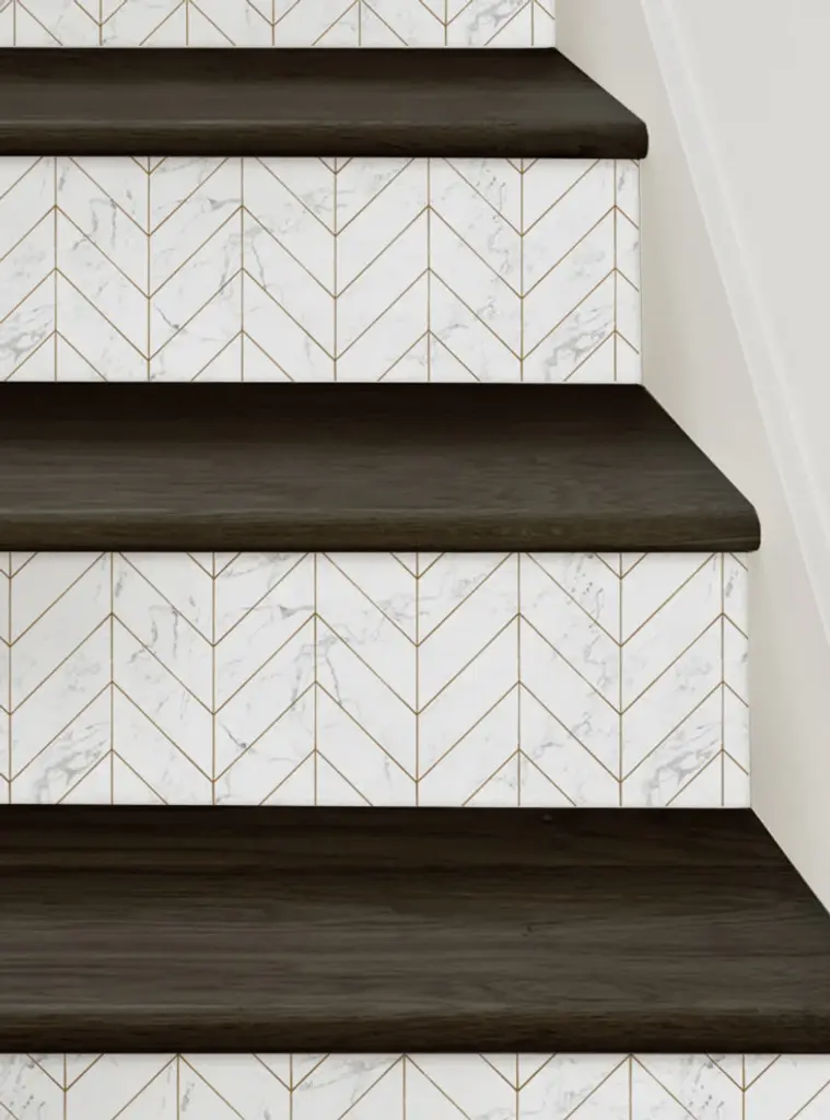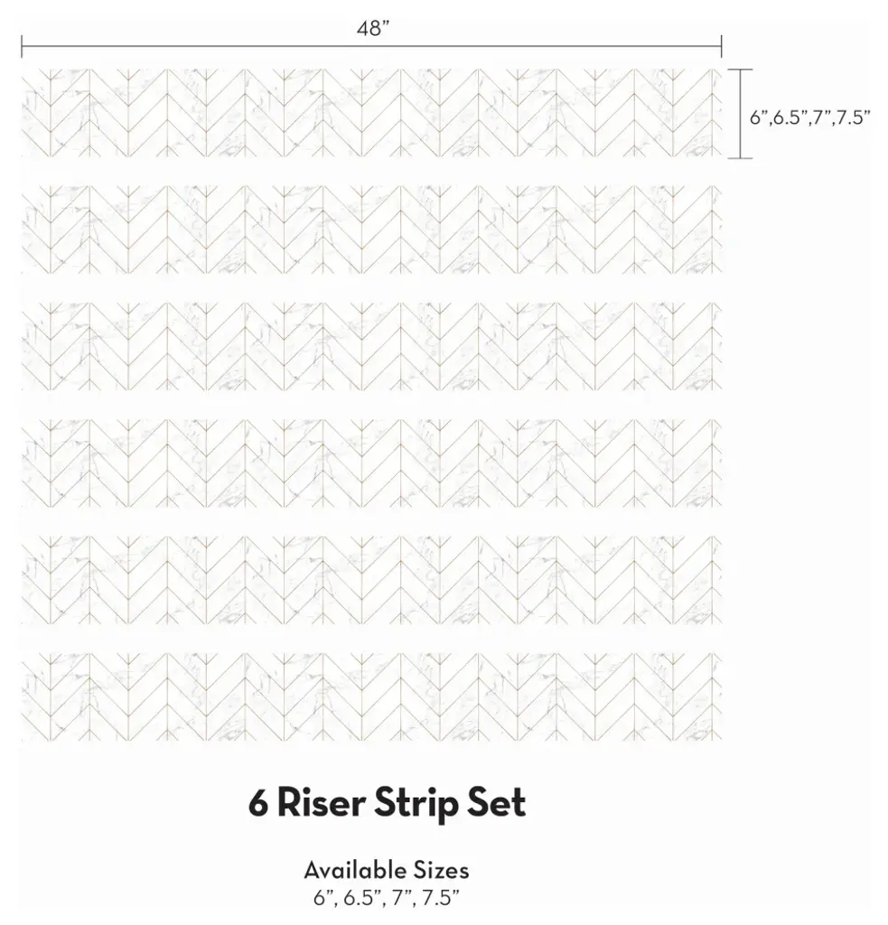 Our Chevron Marble stair riser strips are dazzling new way to add instant elegance to your home! Printed on premium adhesive backed vinyl, this geometric design will accentuate your staircase and add a touch of class to any room. DIY decorating has never been easier with this repositionable vinyl that can be easily applied and removed without any stress or mess!This re-positionable wallpaper is designed and made in our studios in New Jersey. The designs are printed onto an adhesive-backed vinyl that can be removed, repositioned, and reused. The wallpaper does not leave residue on your walls and is ideal for DIY room makeovers without the mess and headaches of traditional wallpaper.Size:48"w x 6"h48"w x 6.5"h48"w x 7"h48"w x 7.5"hWhat''s Included1 sheet of peel-n-stick vinyl stair riser strip
