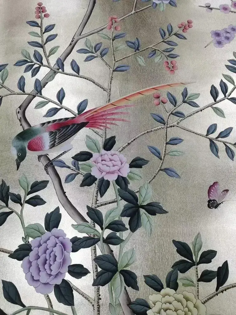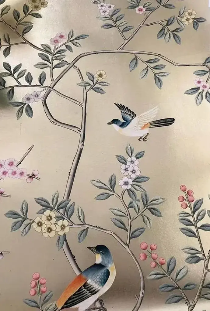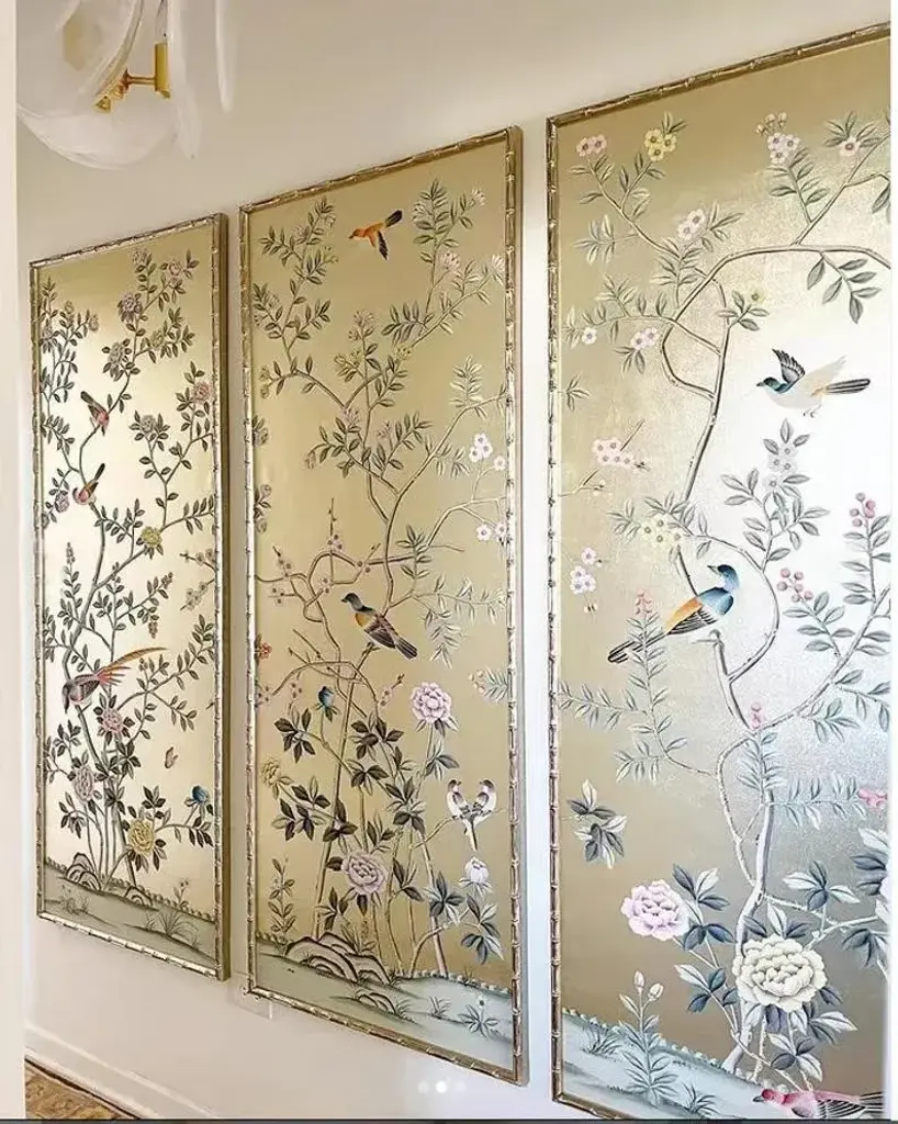 Chinoiserie Hand Painted Artwork On Champagne Metallic Unframed Wallpaper Panels - 3 Panels