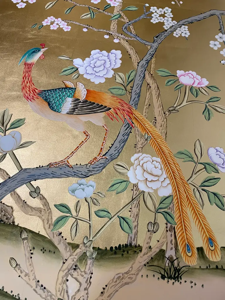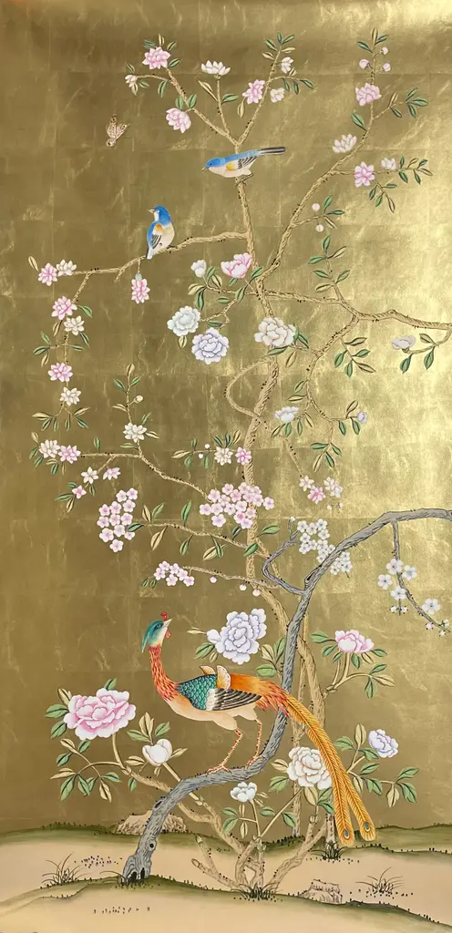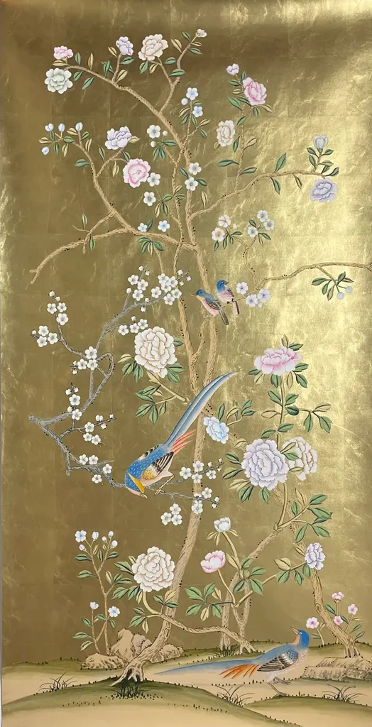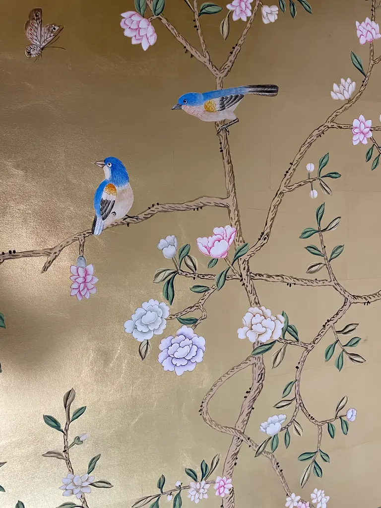 Chinoiserie Hand Painted Floral Wallpaper Murals On Gold Metallic Panel - 2 Panels