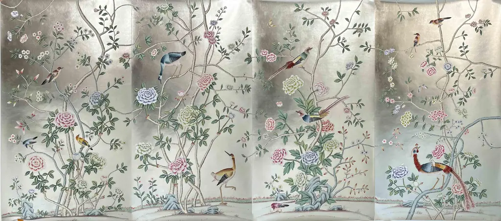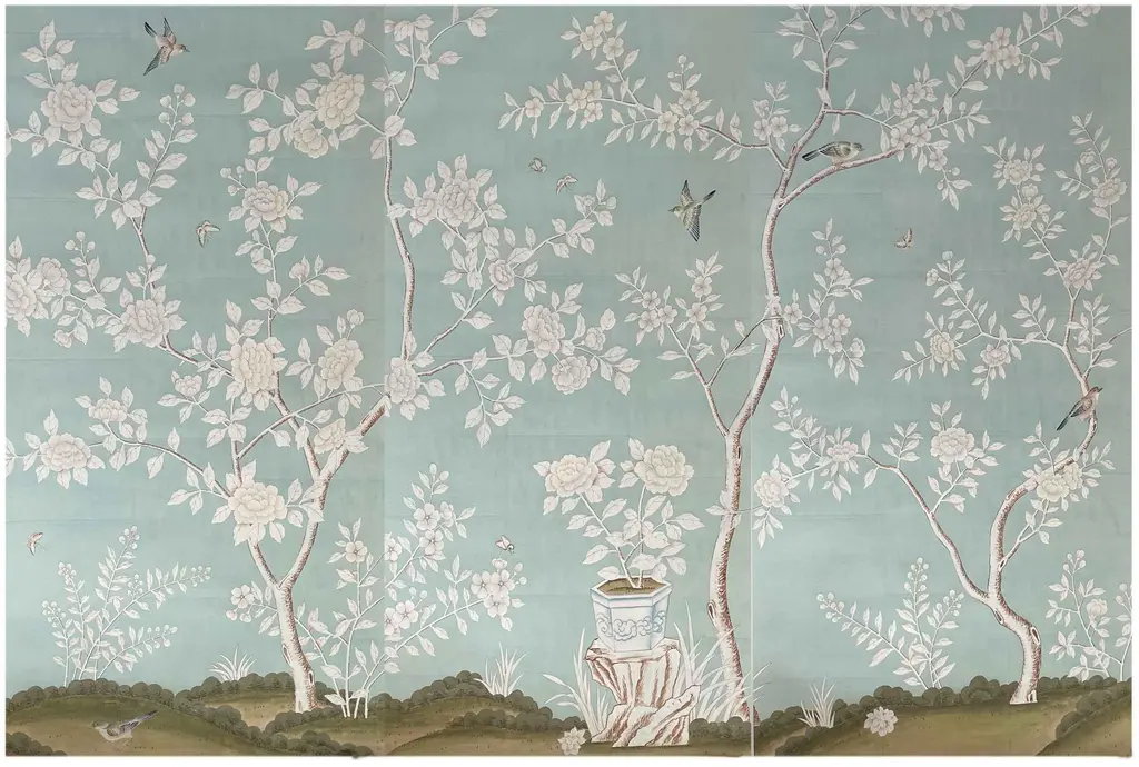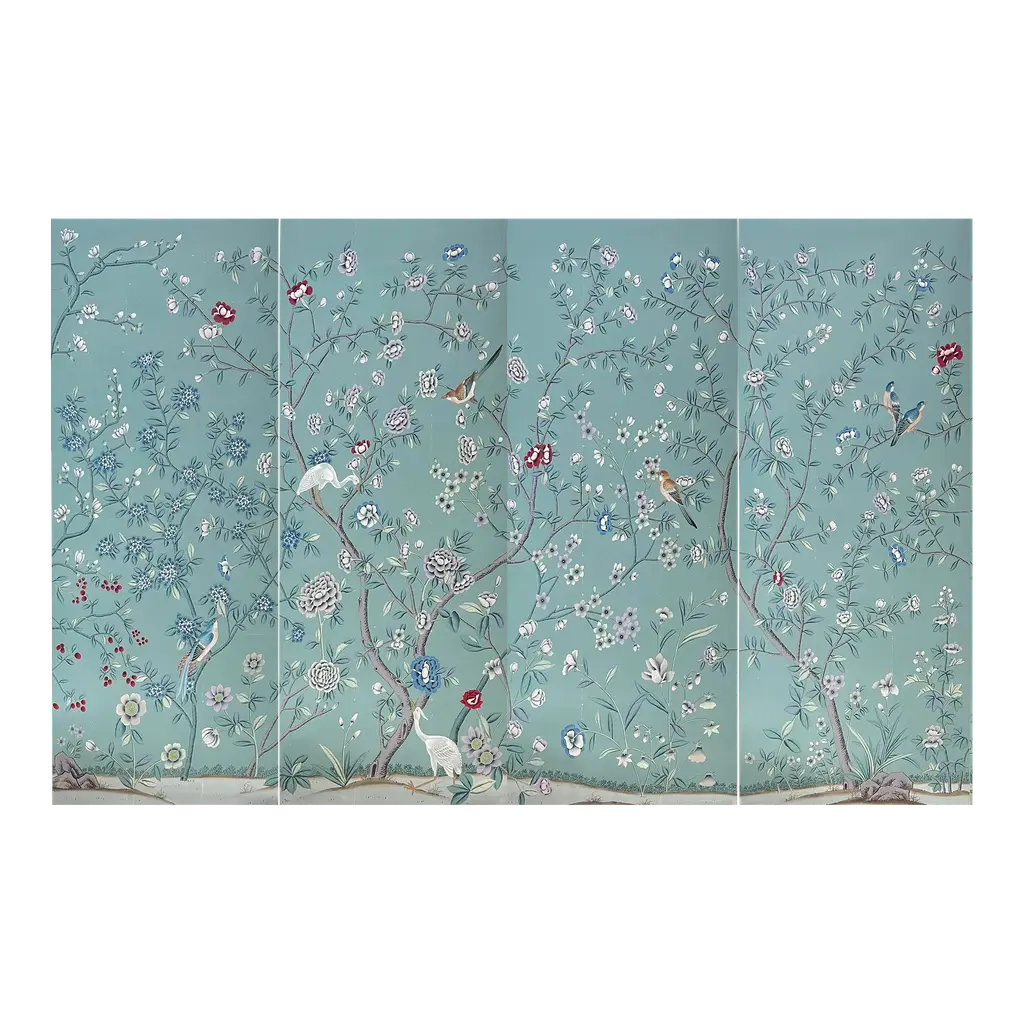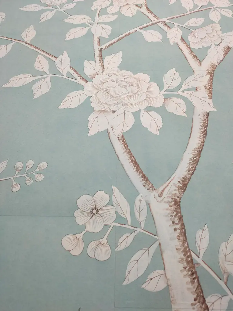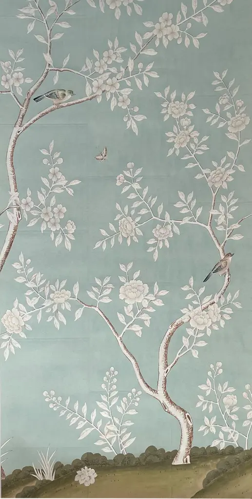 Chinoiserie Hand Painted Floral Wallpaper On Blue Tea Paper Panel - 3 Panels