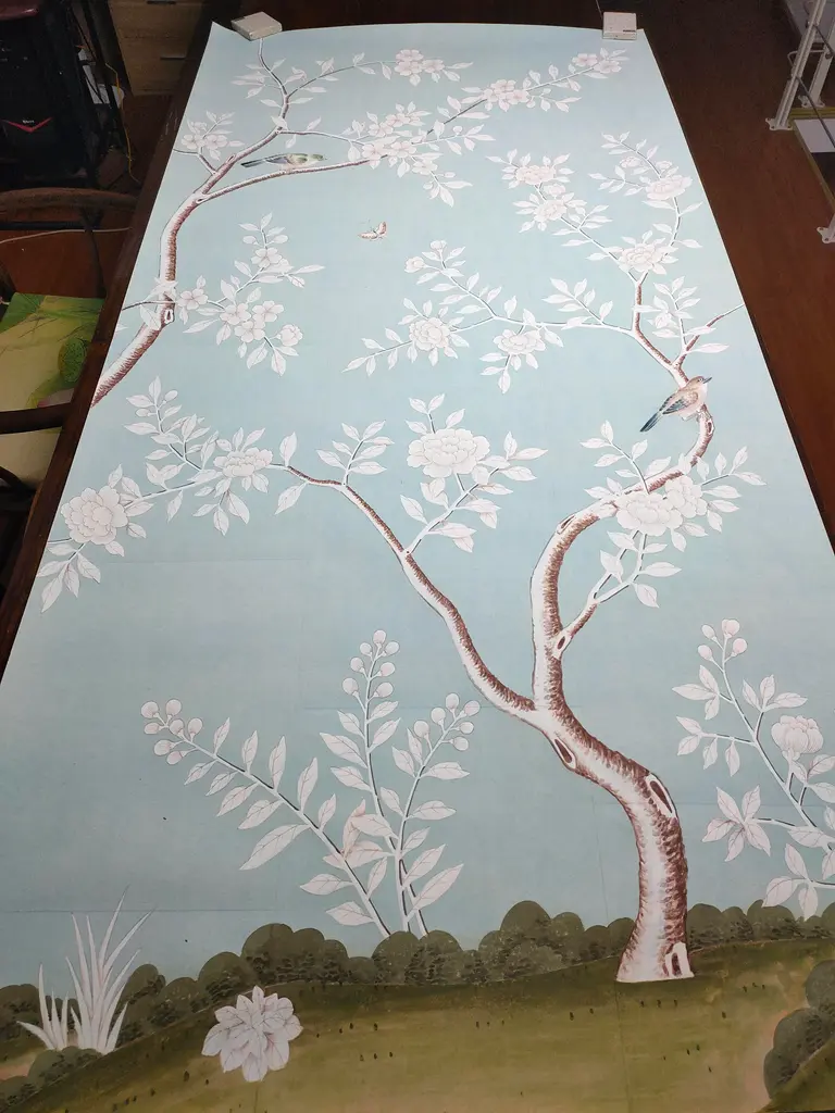 Chinoiserie Hand Painted Floral Wallpaper On Blue Tea Paper Panel 36"x72"/panel